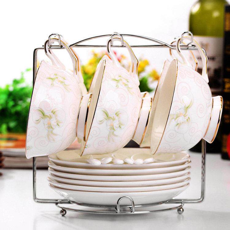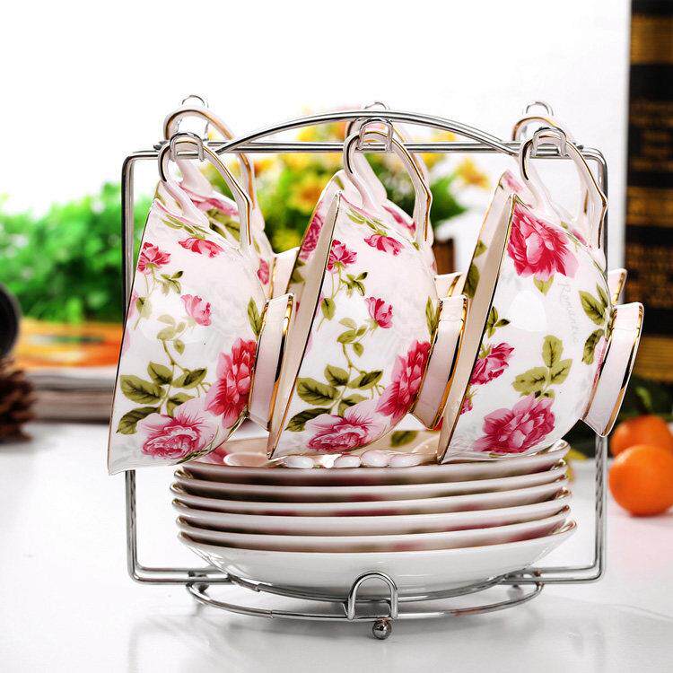欧式花茶陶瓷咖啡杯套装英式骨瓷创意6件套骨瓷咖啡杯碟勺带架子