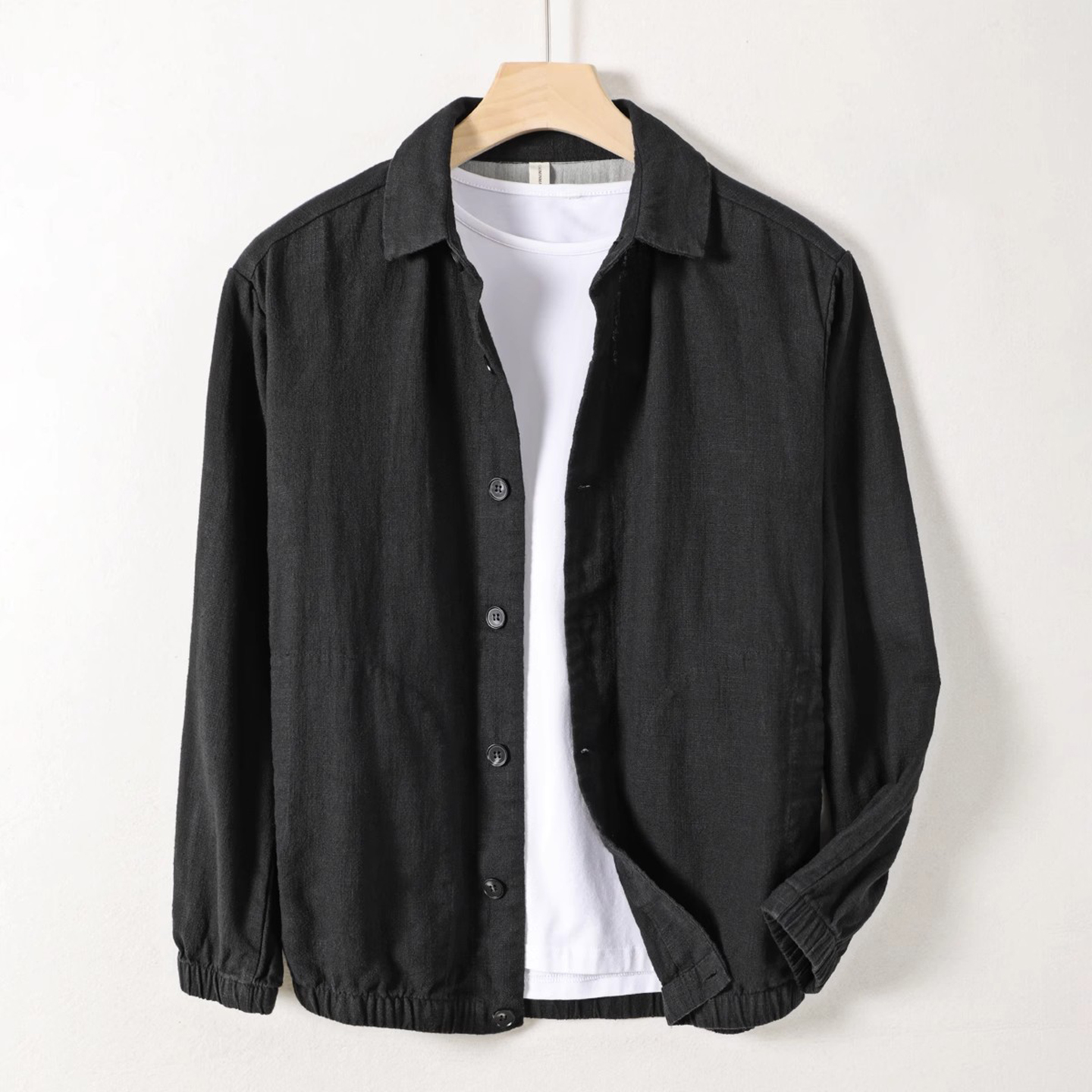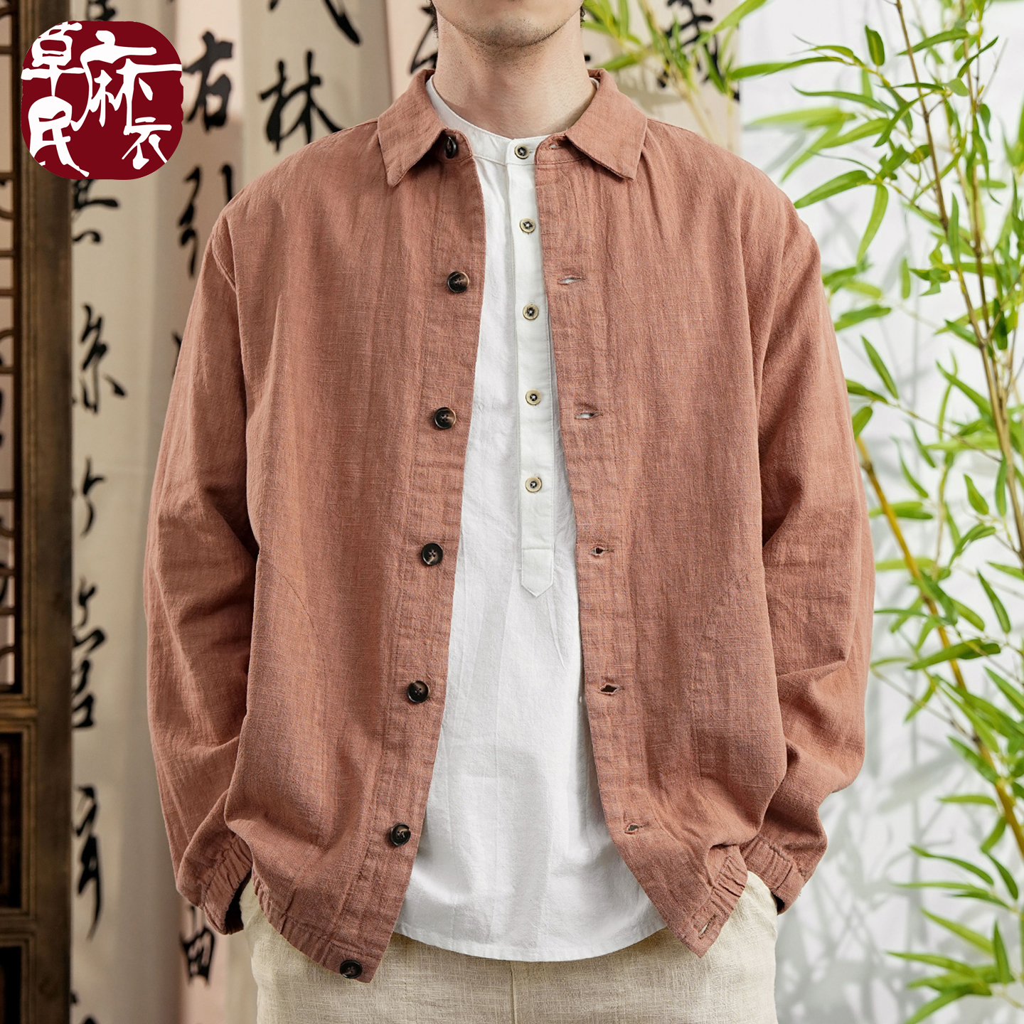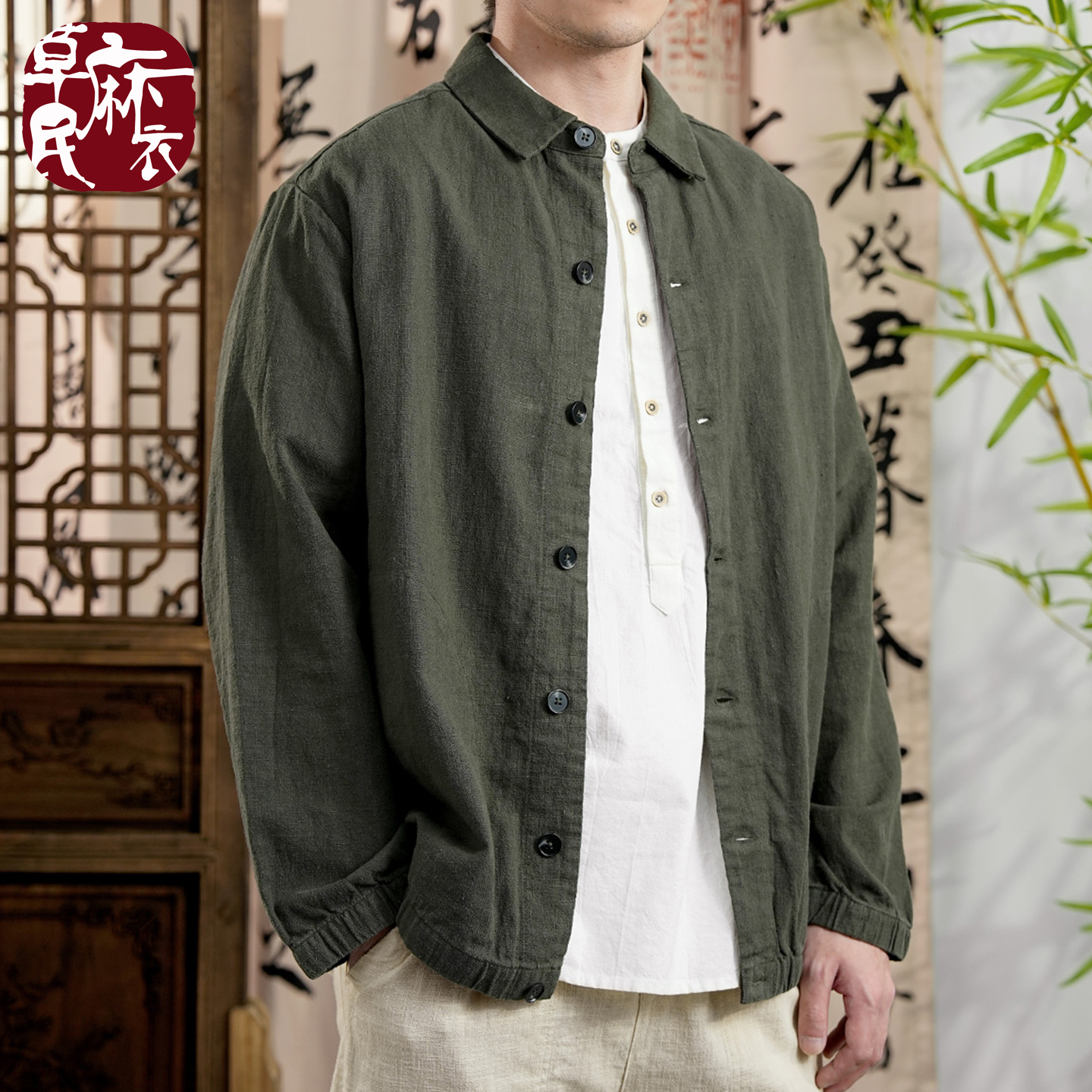草民麻衣秋季新款苎麻长袖翻领夹克衫男中式国风棉麻衬衫外套上衣