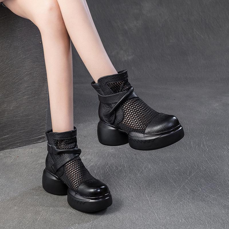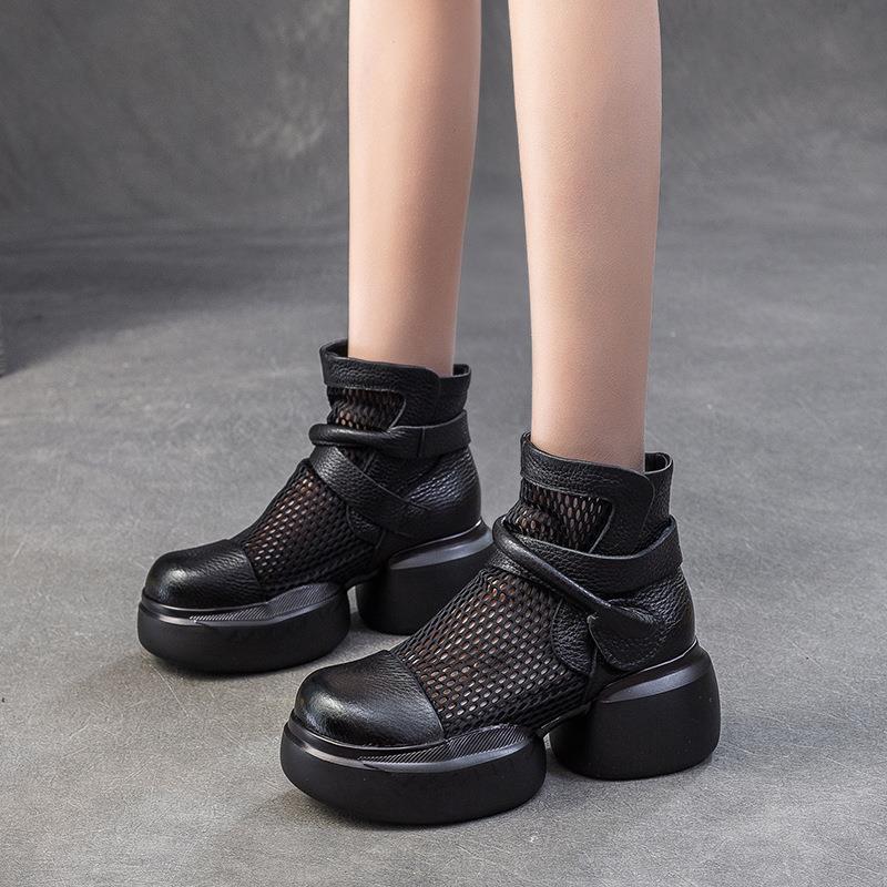 2025春秋新款粗跟透气网面镂空高帮凉靴复古舒适通勤女鞋