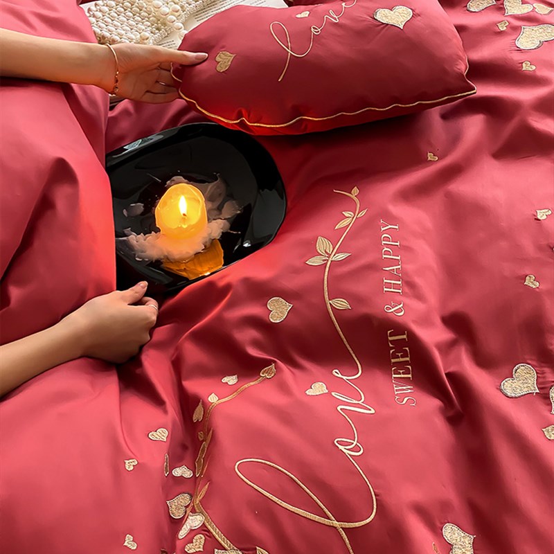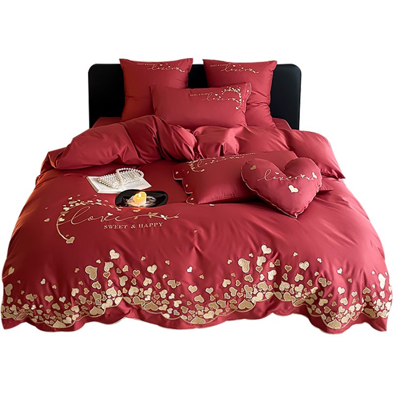结婚红色婚庆四件套纯棉100支长绒棉浪漫花卉刺绣被套床上用品1.8