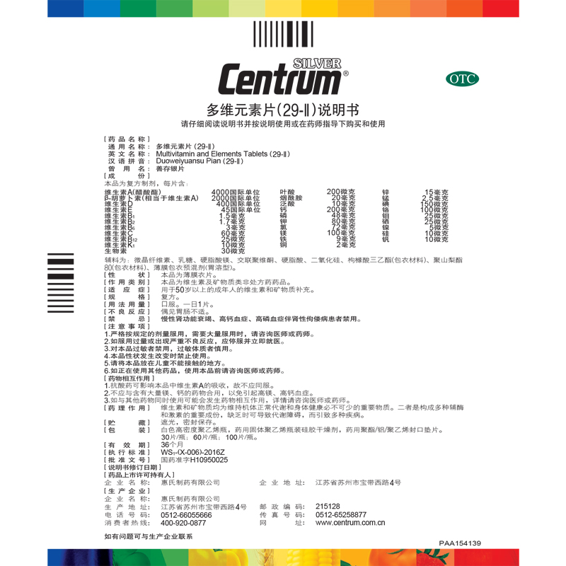 【自营】【银善存】多维元素片(29-Ⅱ)30片*1瓶/盒