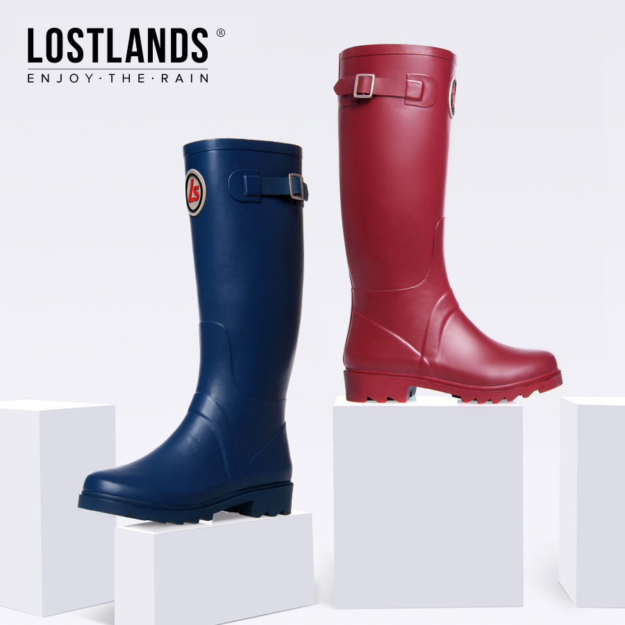 LOSTLANDS时尚军旅徽章女式纯色橡胶雨鞋女士高筒雨靴橡胶靴