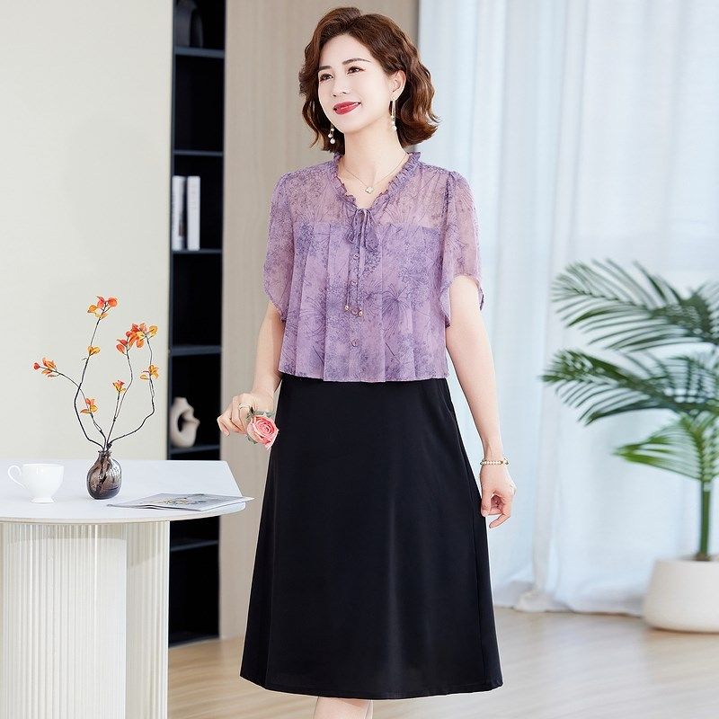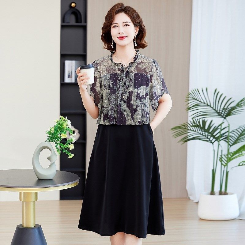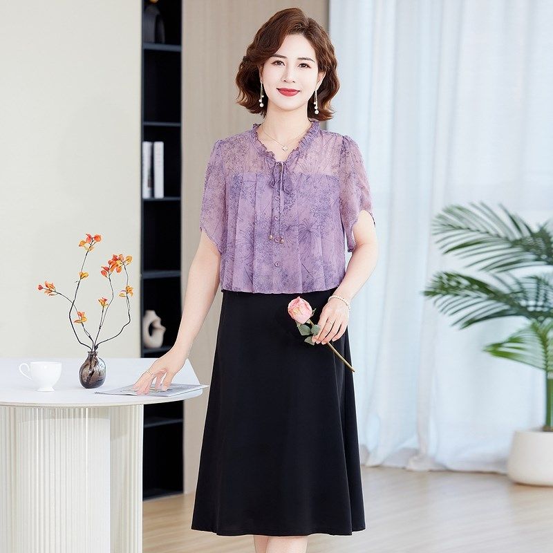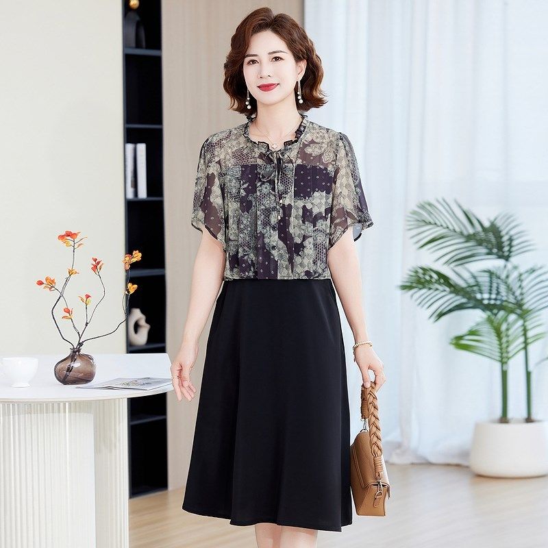 妈妈夏装碎花雪纺连衣裙2025新款中老年人气质收腰显瘦中长裙子女
