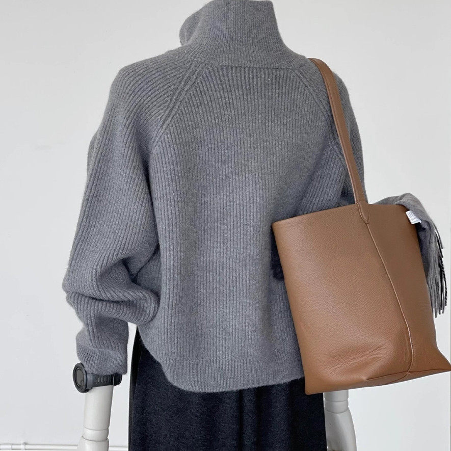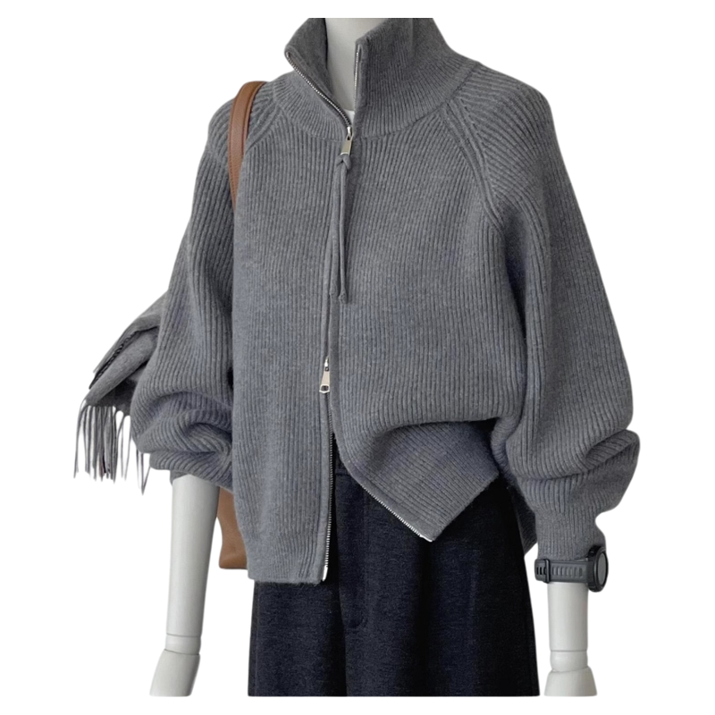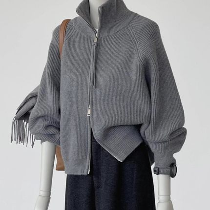 双拉链灰色高领针织开衫女秋冬季新款宽松慵懒风毛衣外套加厚上衣
