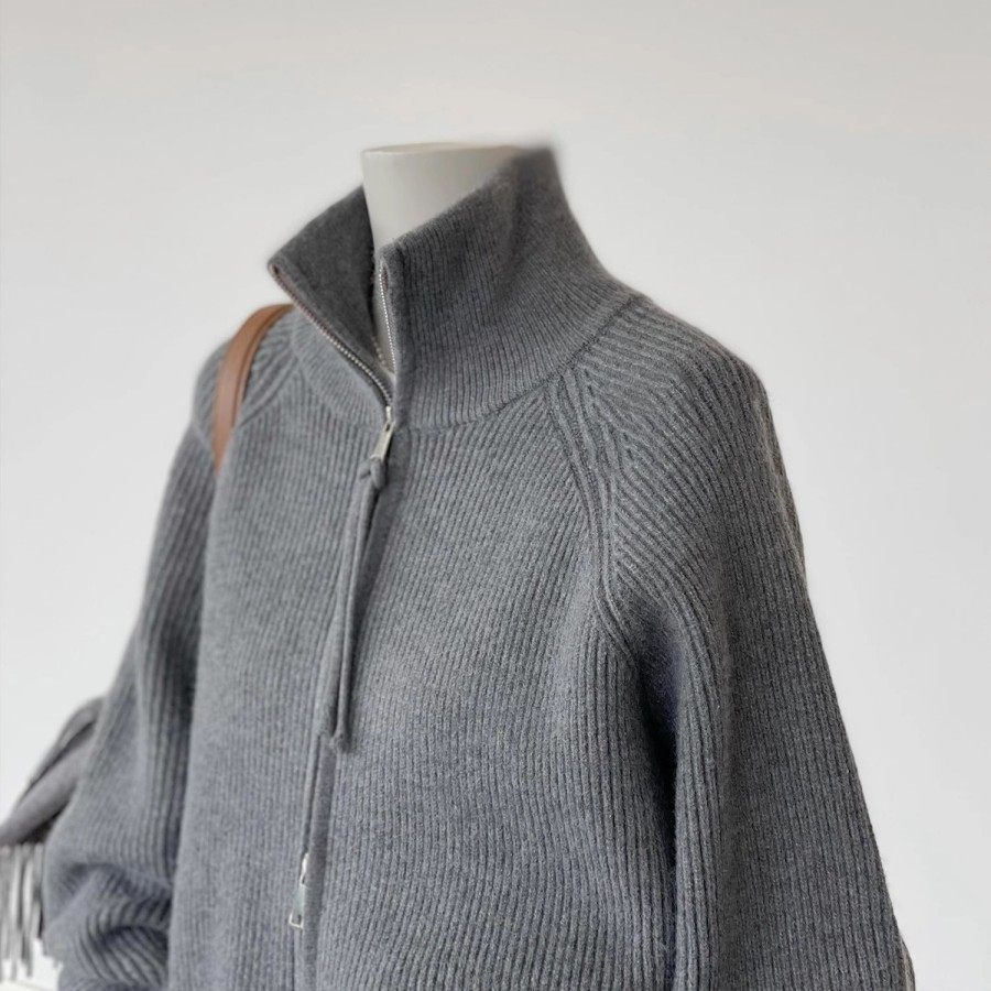 双拉链灰色高领针织开衫