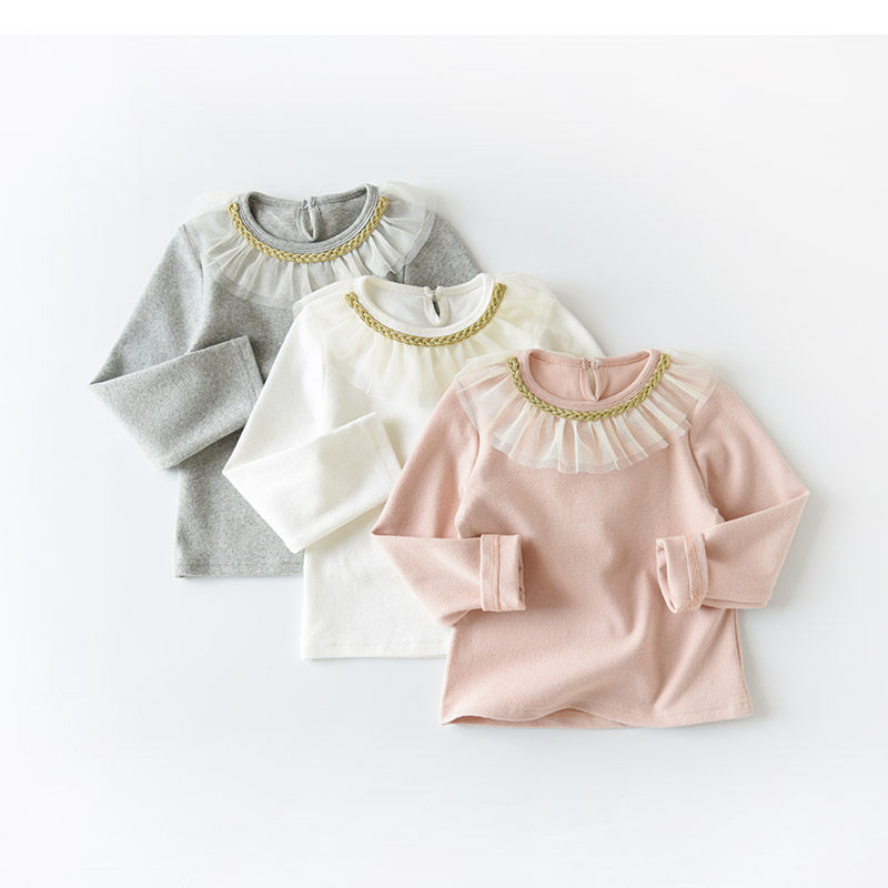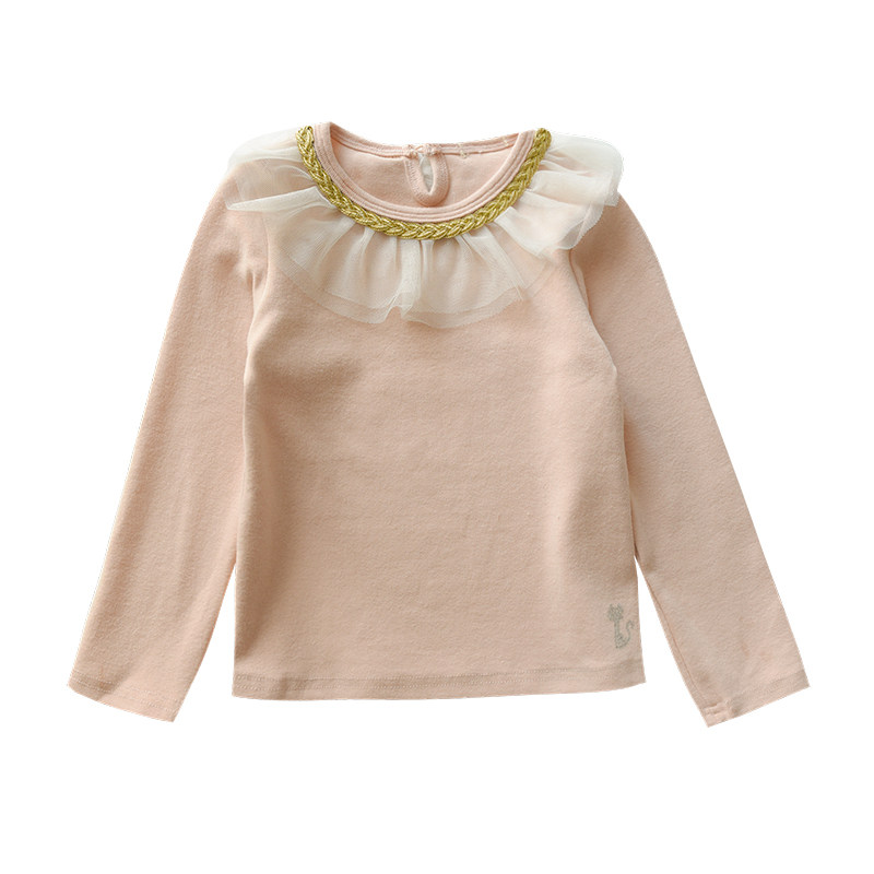 儿童纯棉打底衫 女童蕾丝荷叶领长袖T恤 纯色上衣 中童春秋款童装