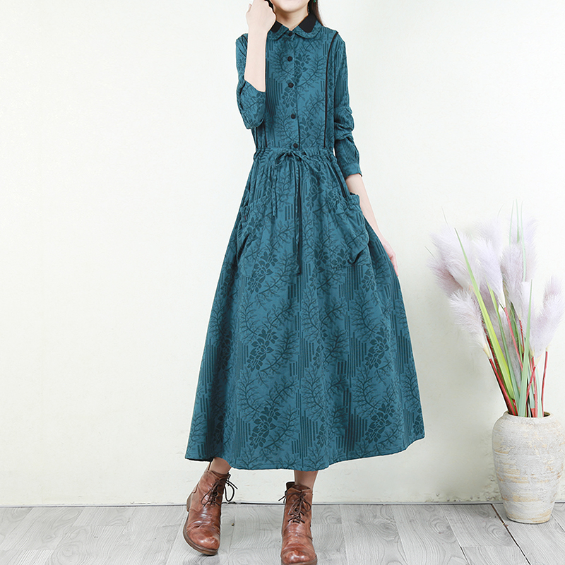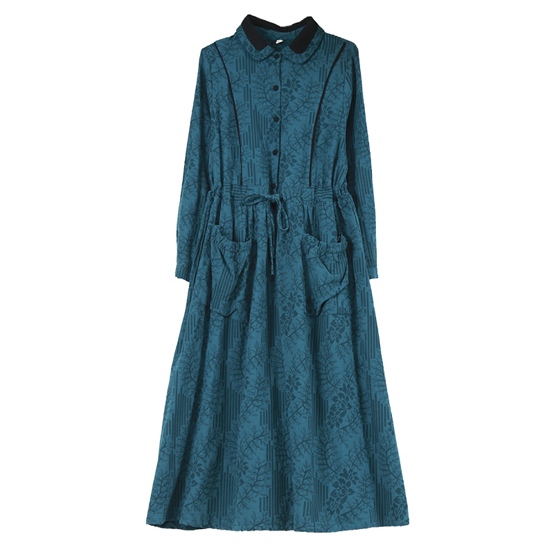 复古文艺加厚亚麻棉刺绣连衣裙春秋季拼接领超长款系带长裙子宽松