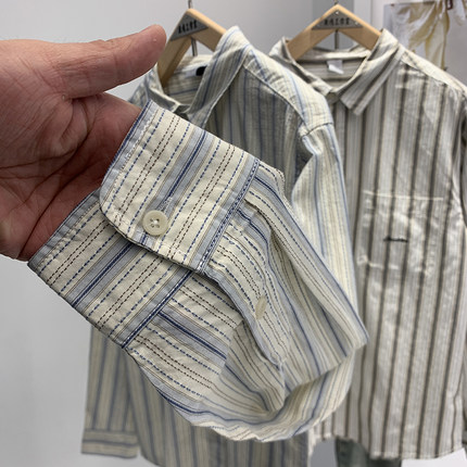 翻领竖条纹100%棉休闲长袖衬衫男
