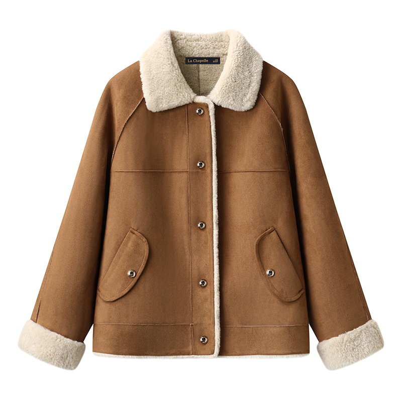 拉夏贝尔/La Chapelle秋冬宽松麂皮绒翻领外套小个子保暖上衣女