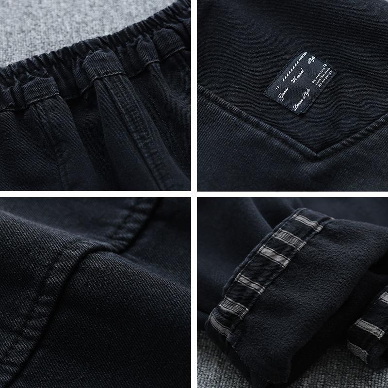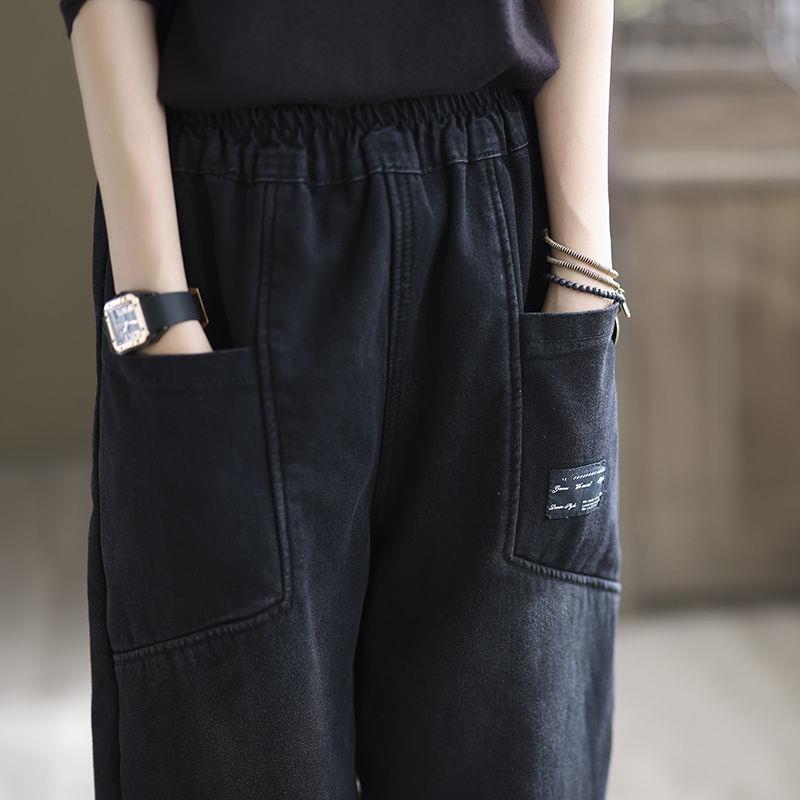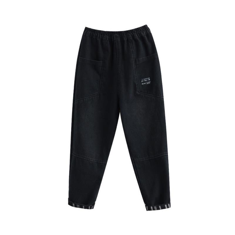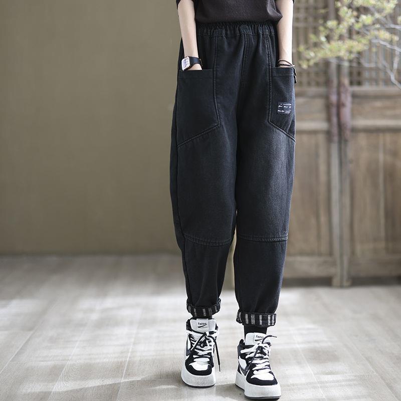 牛仔裤女秋冬加绒加厚宽松大码复古口袋松紧腰黑色休闲长裤哈伦裤