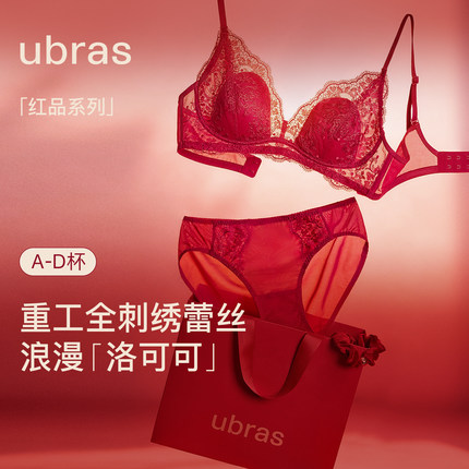 ubras蕾丝红色内衣女性感小胸聚拢礼袋新娘结婚送礼本命年文胸罩