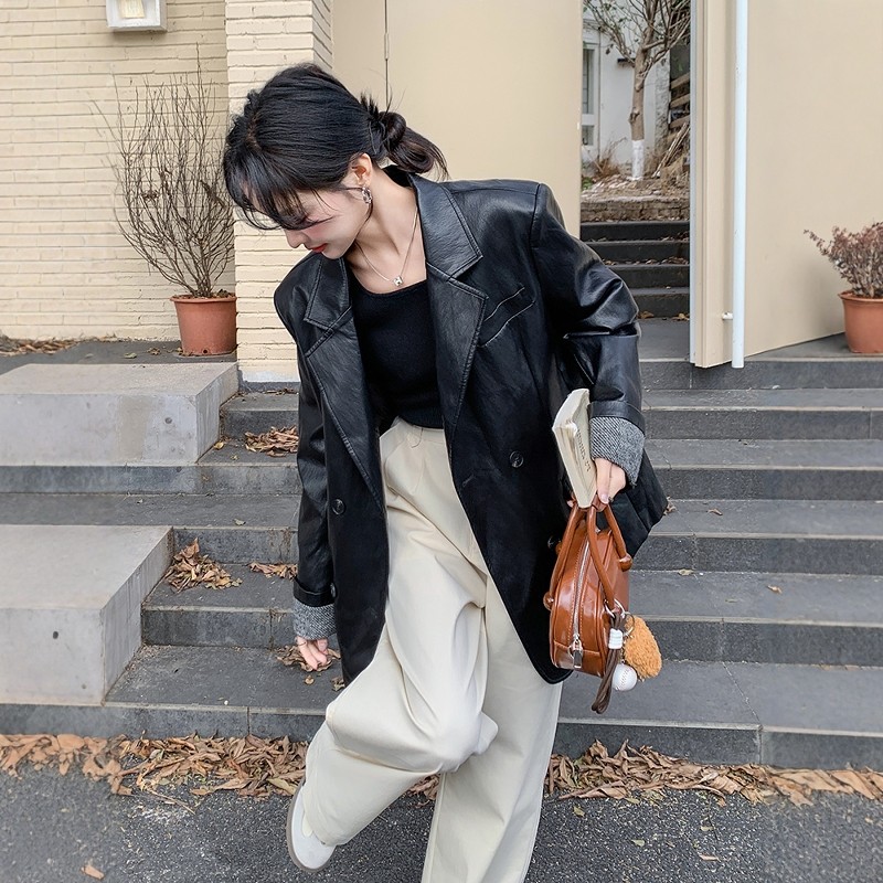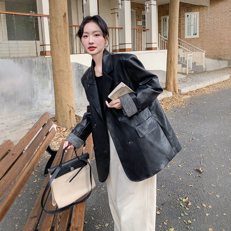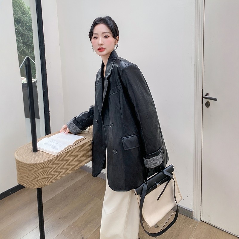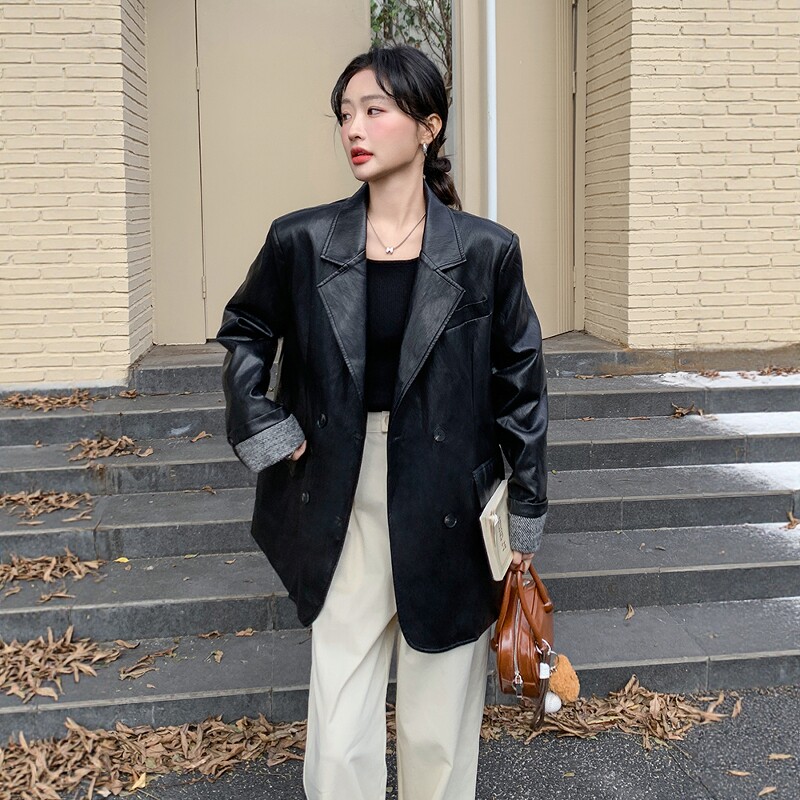 高级感黑色PU皮衣西装外套女2025秋冬新款港风复古时尚百搭小西服