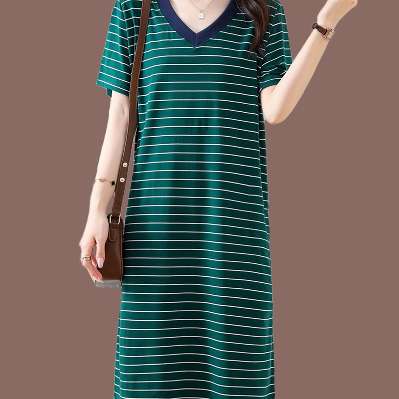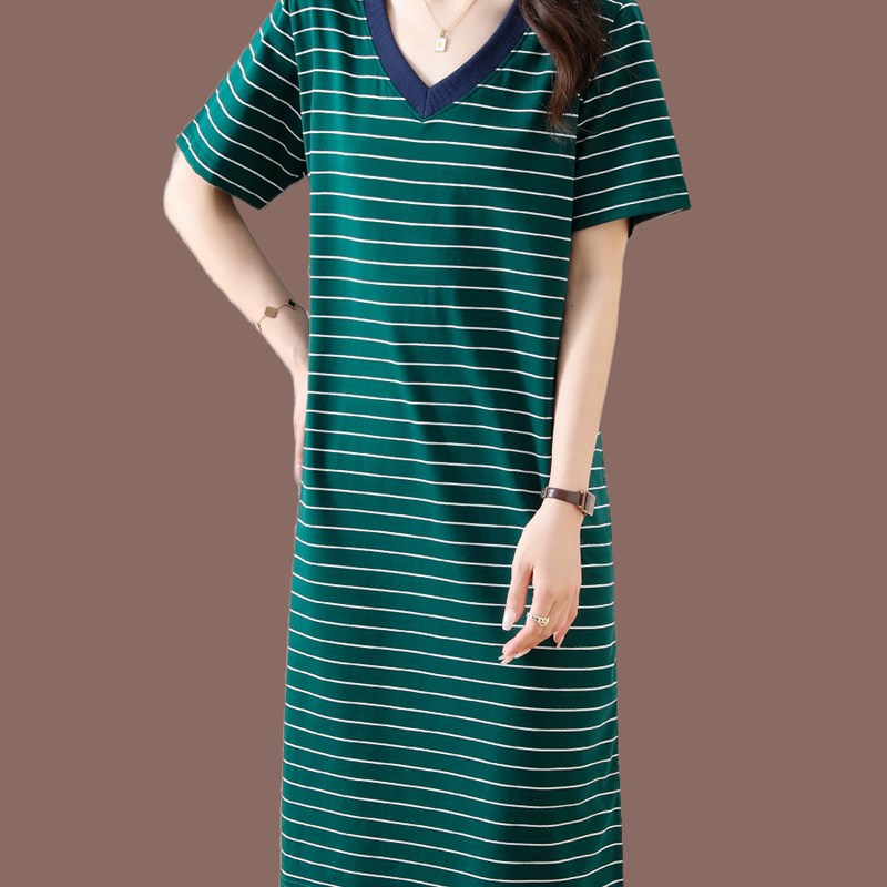 纯棉V领条纹连衣裙女夏季短袖中年妈妈长款过膝大码休闲全棉t恤裙