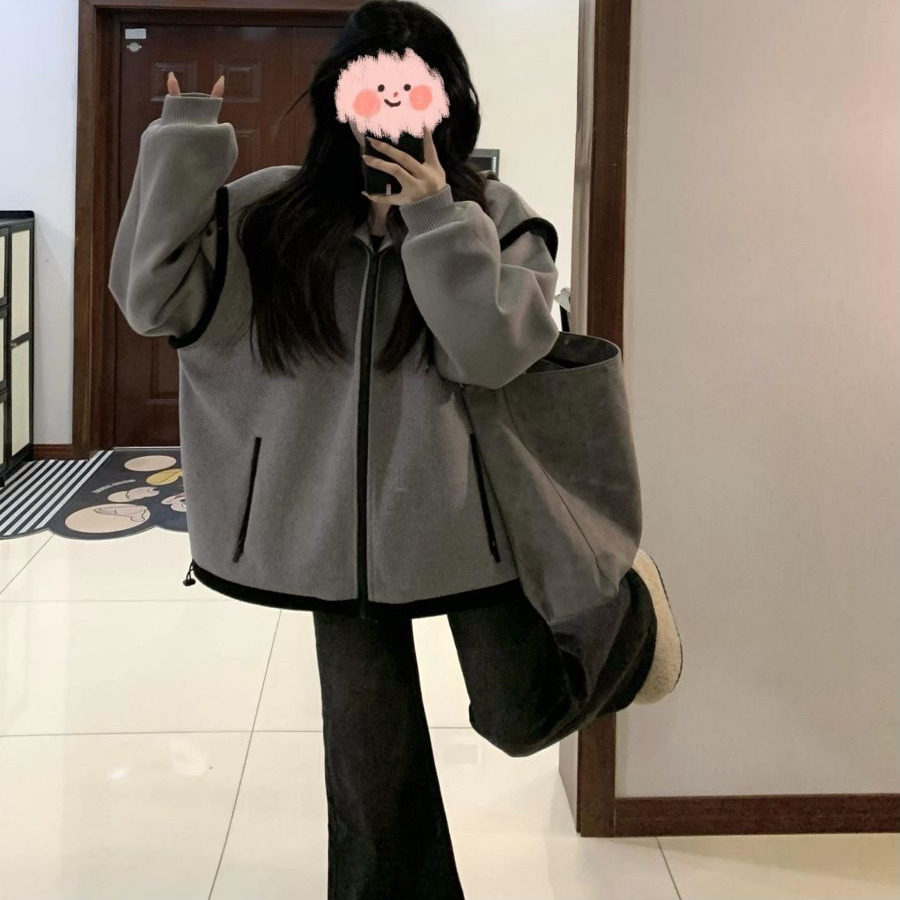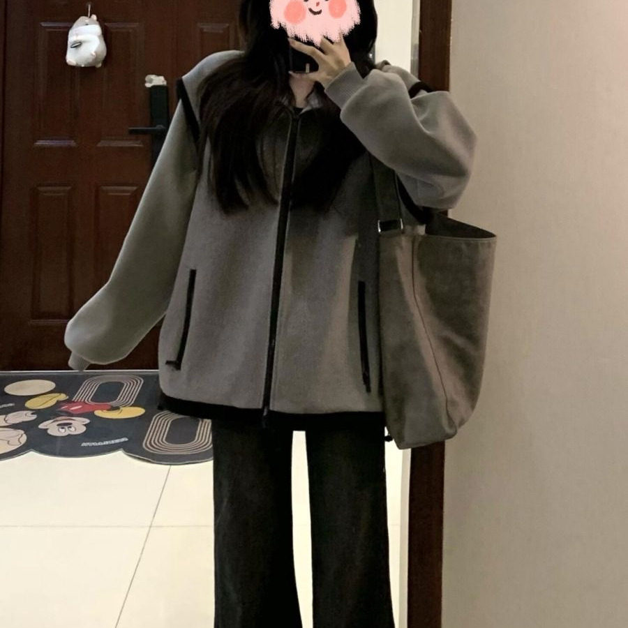 美式复古灰色拼接毛呢外套男女春秋休闲宽松百搭廓形棒球服上衣潮