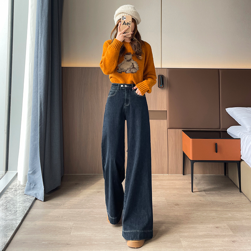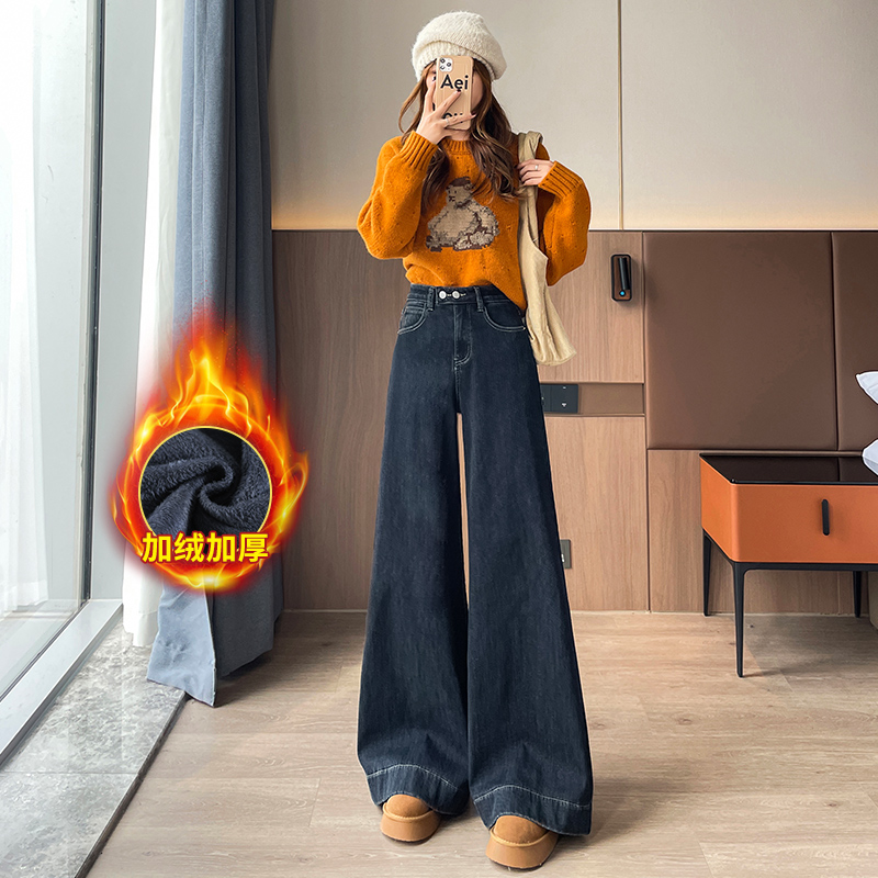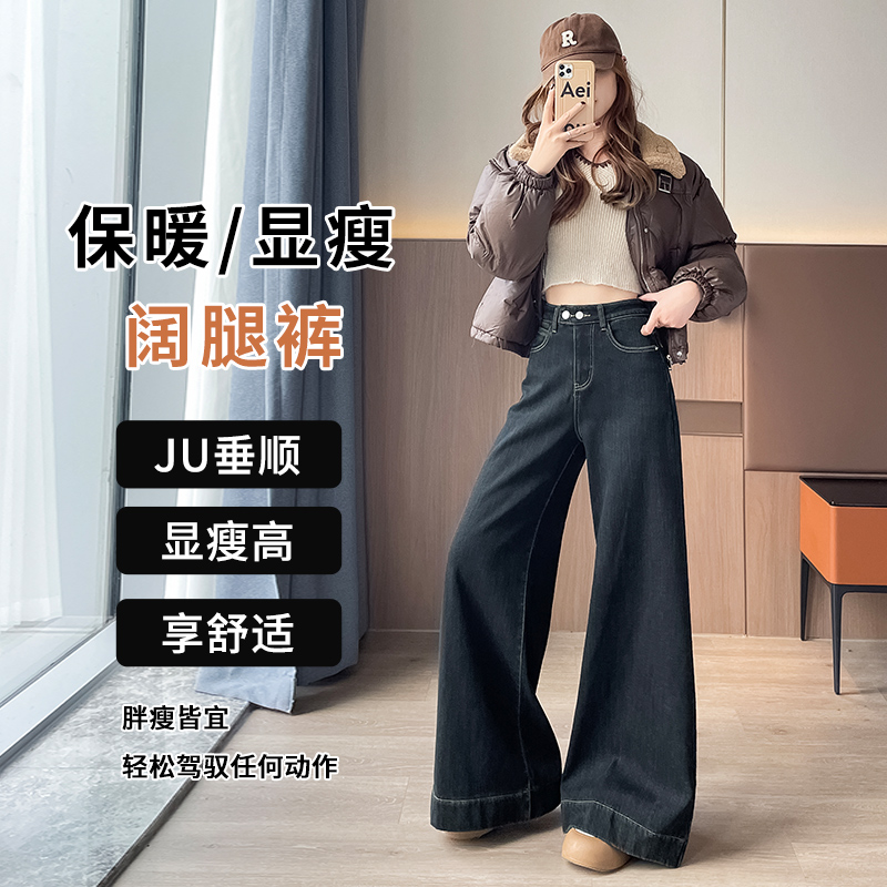 阔腿牛仔裤女加绒爆款2024秋季新款高腰宽松显瘦深蓝色垂感长裤子