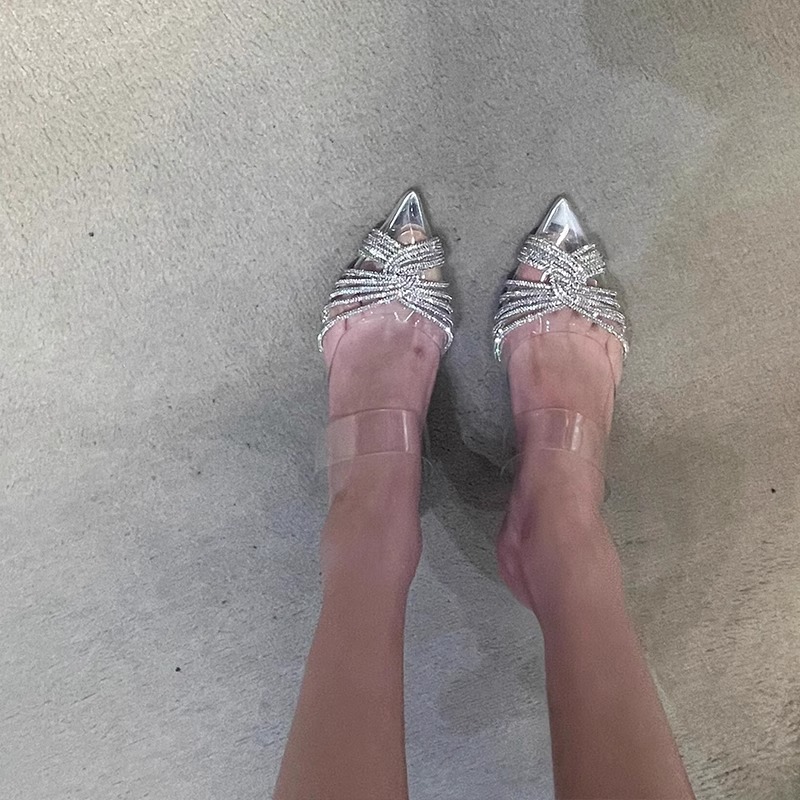 包头浅口水钻透明PVC一字带拖鞋女夏季新款性感半拖鞋水晶高跟鞋