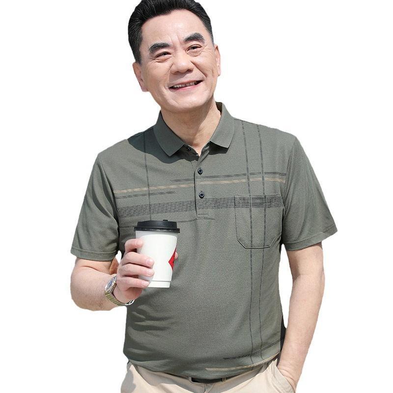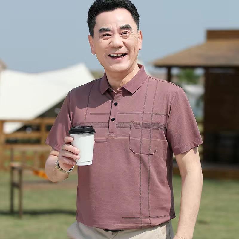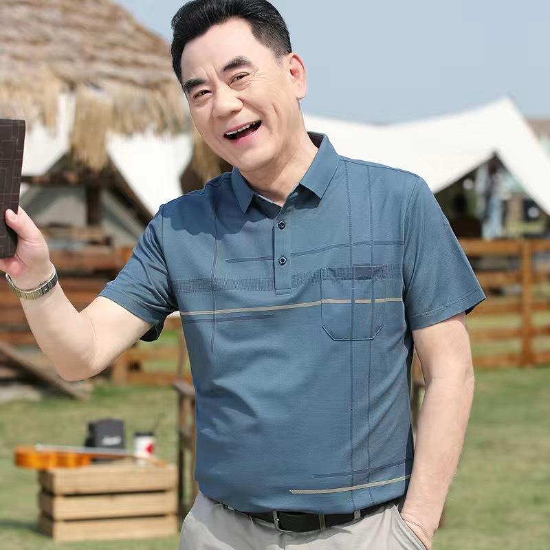爸爸夏装短袖t恤男中年丝光棉Polo衫上衣男中老年宽松凉感格子t恤