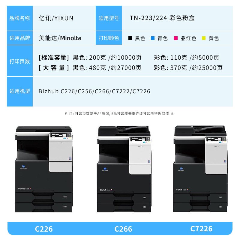 亿讯适用柯尼卡美能达bizhub C226 C256 C266碳粉盒C7222 C7226墨粉盒TN223 TN224 adc225 265复印机彩色墨盒