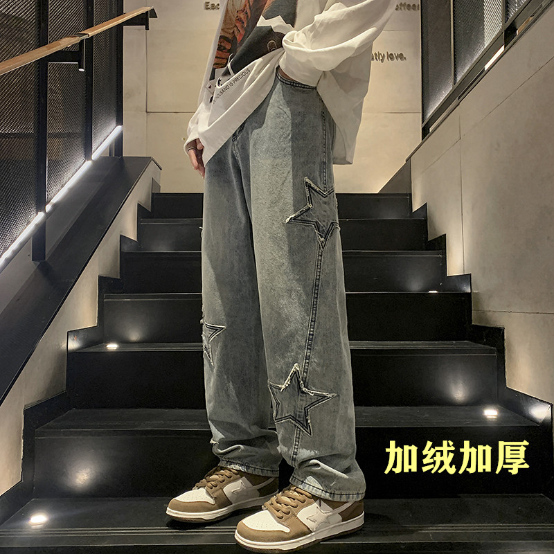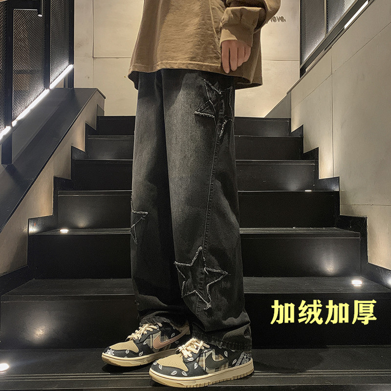 加绒加厚牛仔裤男款2025秋冬阔腿美式高街水洗宽松直筒阔腿长裤子