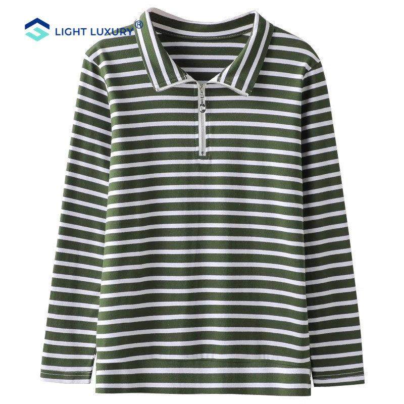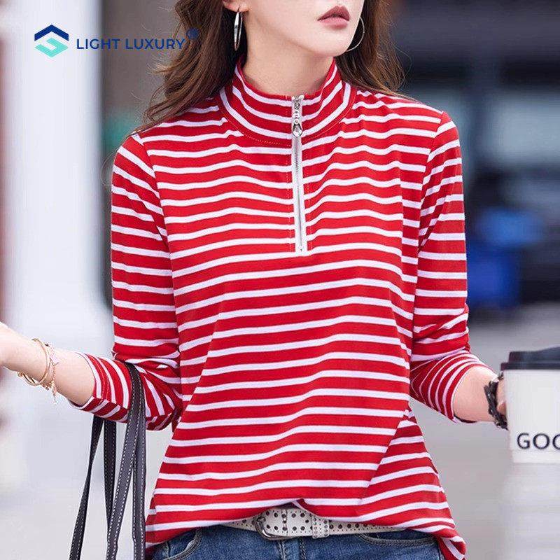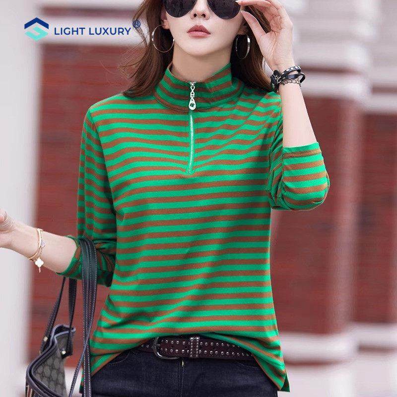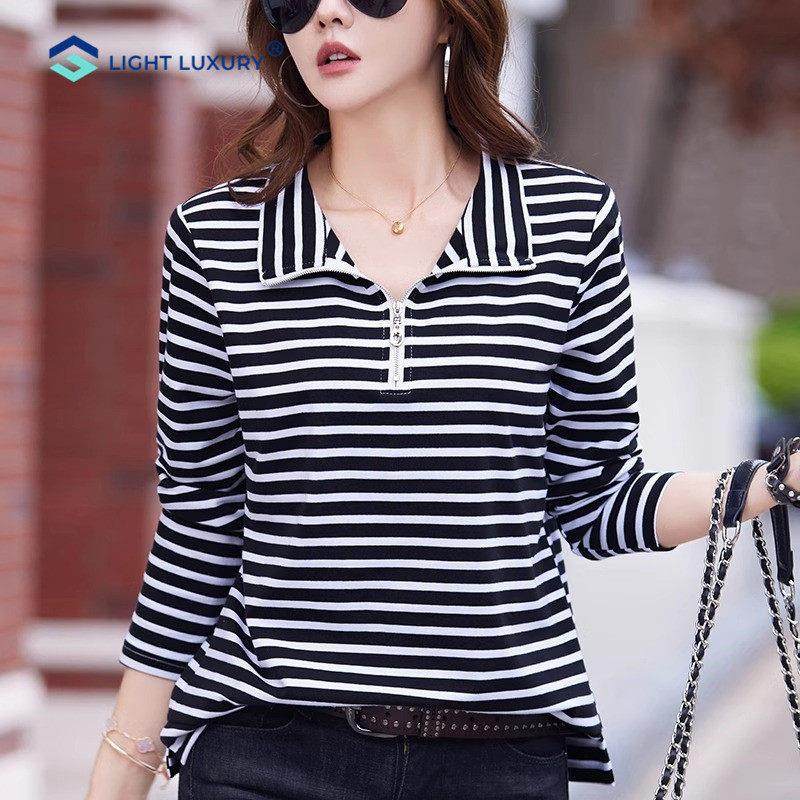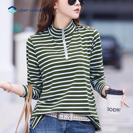长袖T恤女春秋新款洋气时尚立领打底衫宽松休闲翻领条纹外穿上衣