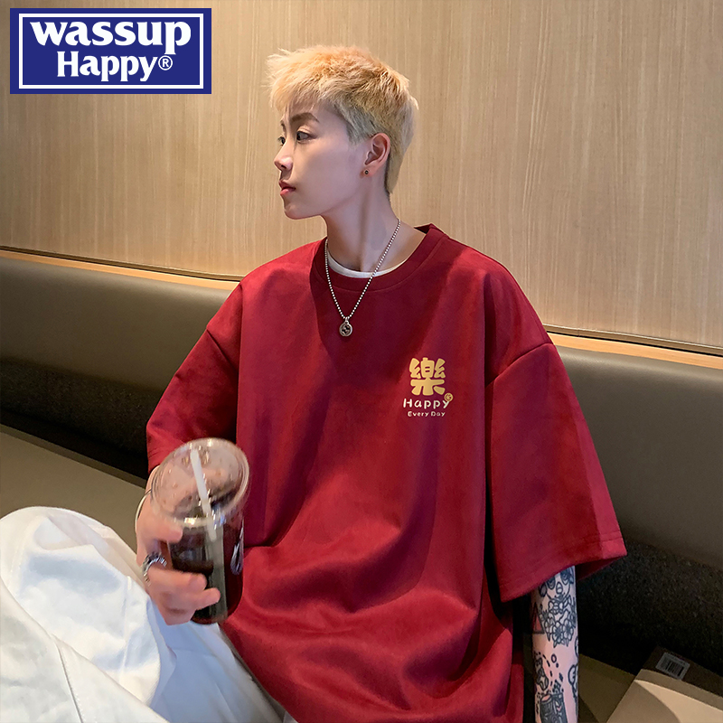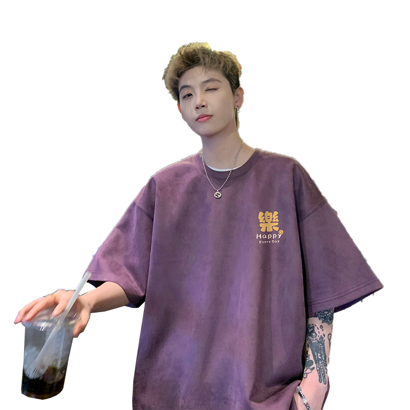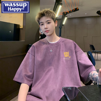 wassup happy乌梅紫色重磅麂皮短袖t恤男夏季潮牌休闲圆领上衣服