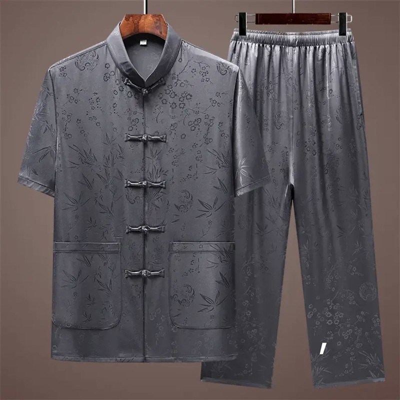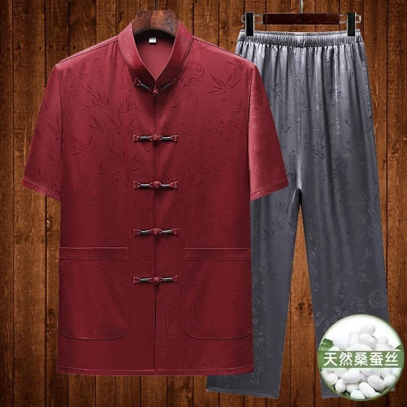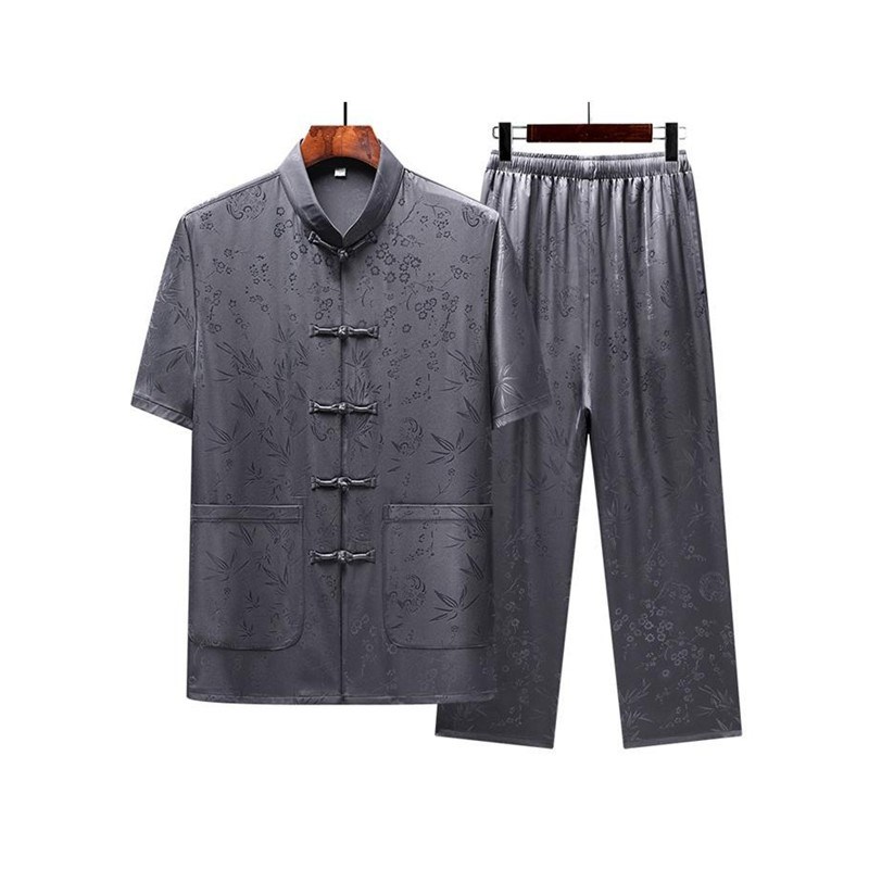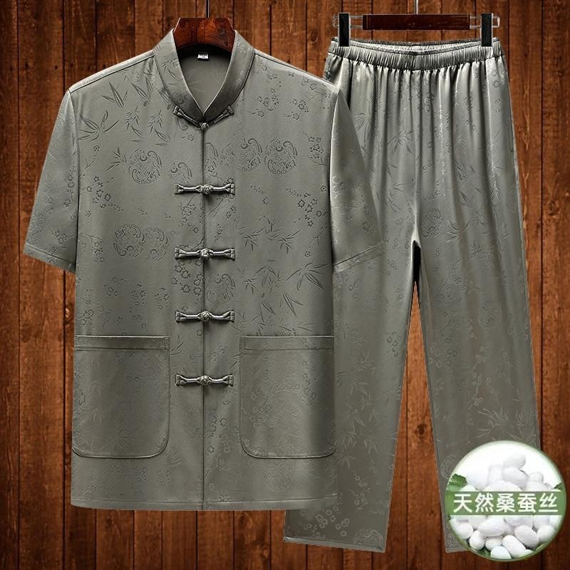 聚福鑫甄选中老年唐装男短袖蚕丝套装爸爸爷爷新中式太极服夏季薄