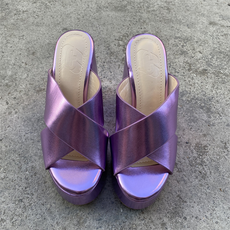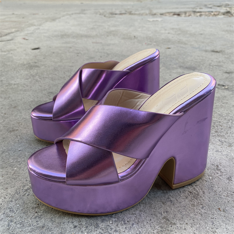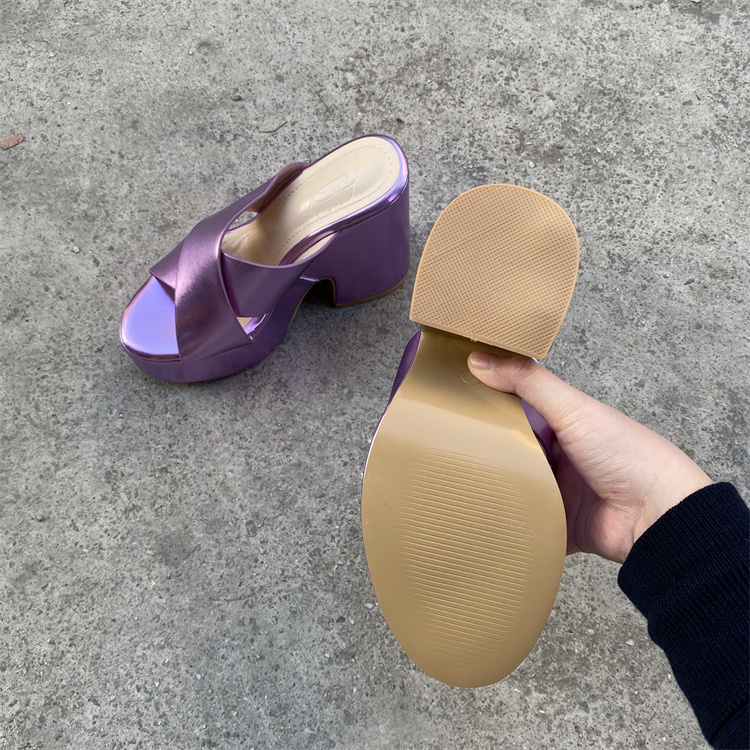 外贸超高跟12cm紫色粗跟鞋欧美交叉带露趾防水台外穿大码凉拖鞋女