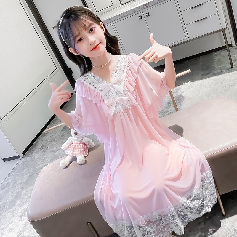 女童夏季睡裙g中长款2025新款中大童短袖蕾丝睡衣时髦家居服粉睡