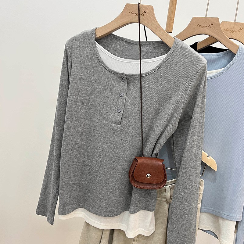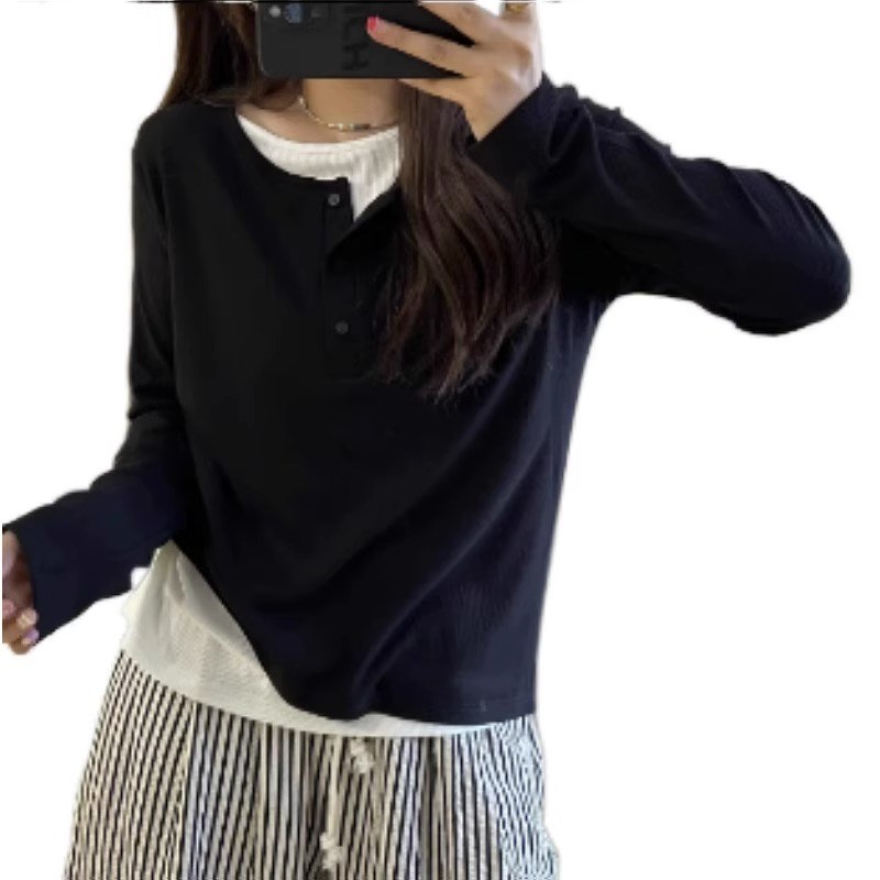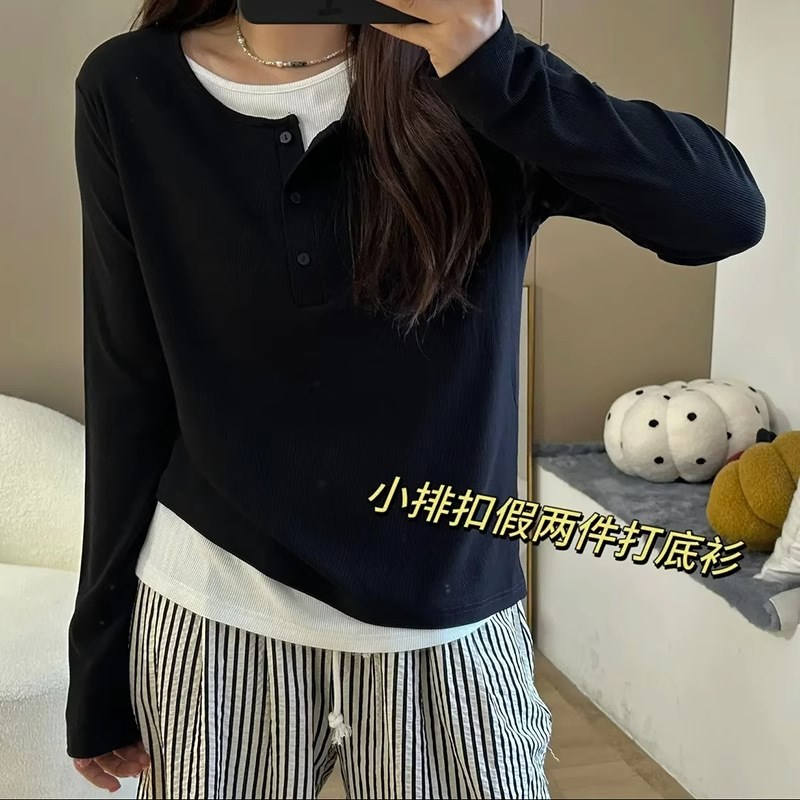 小排扣假两件t恤女长袖早秋季设计D感小众撞色宽松上衣内搭打底衫