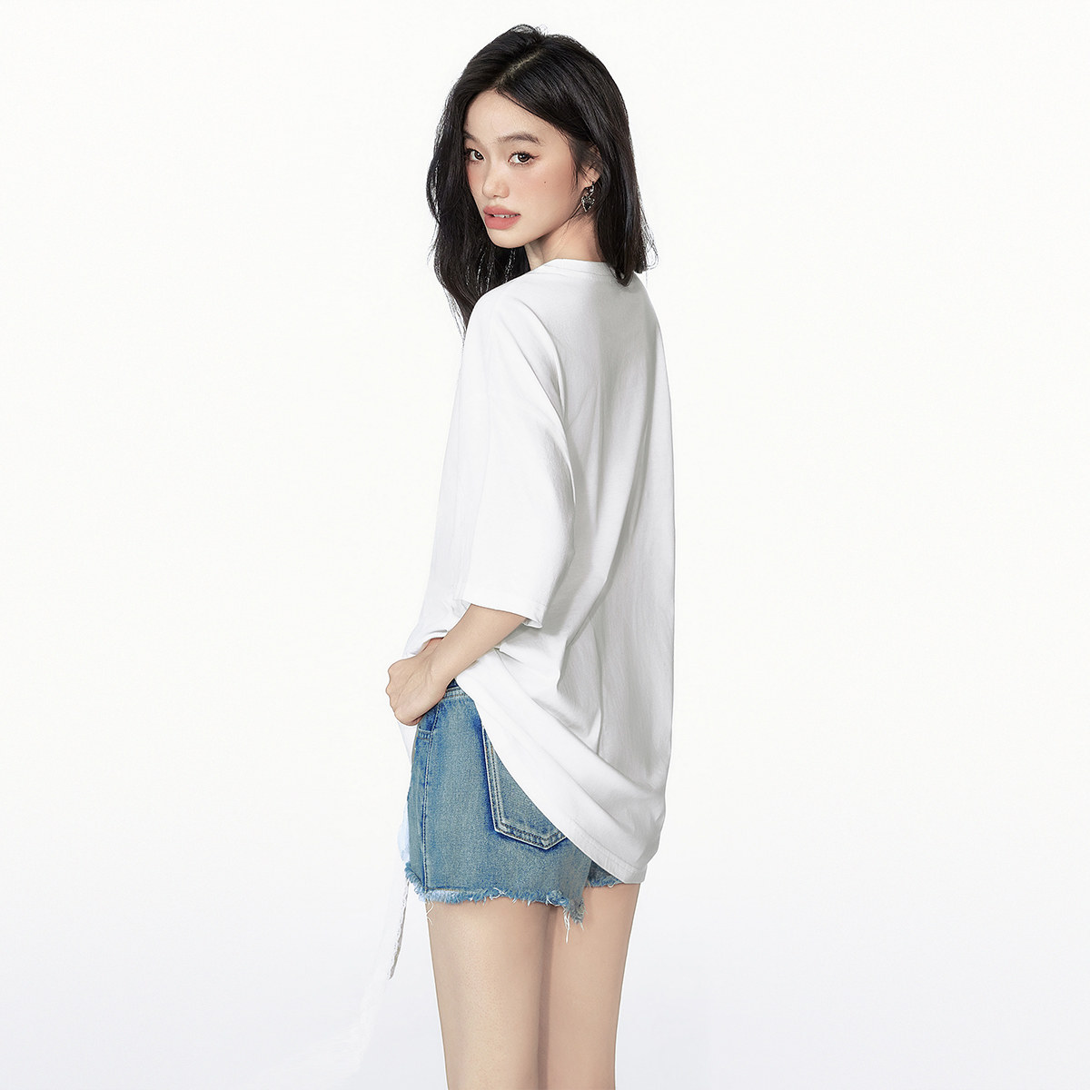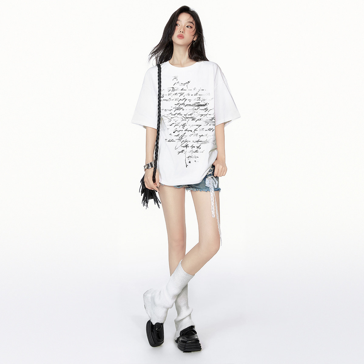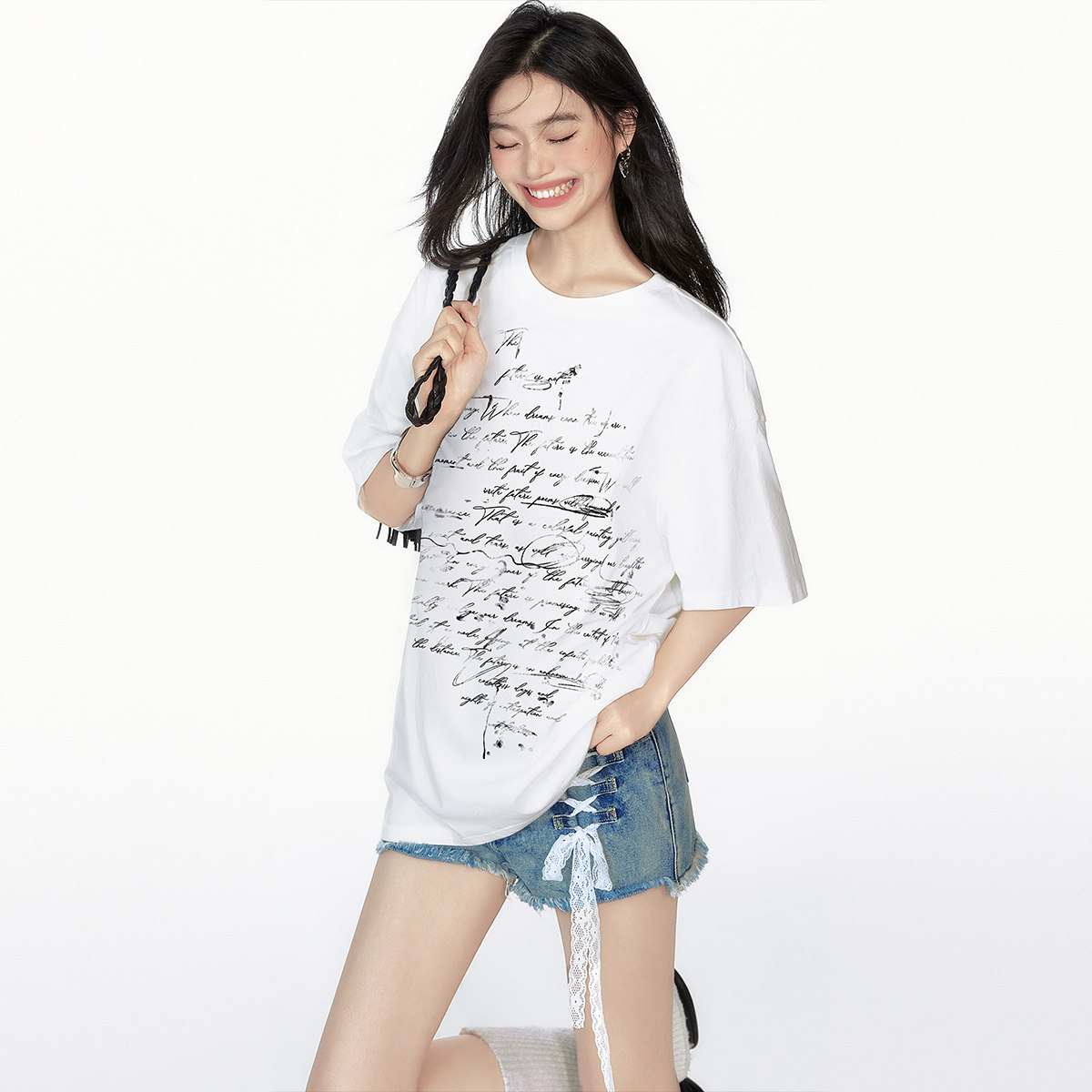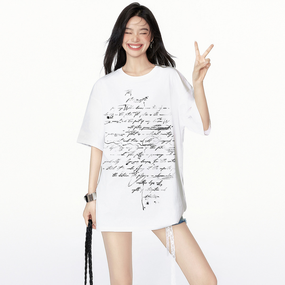 EPTISON短袖T恤女2025夏季新款复古独特印花宽松纯棉白色休闲上衣