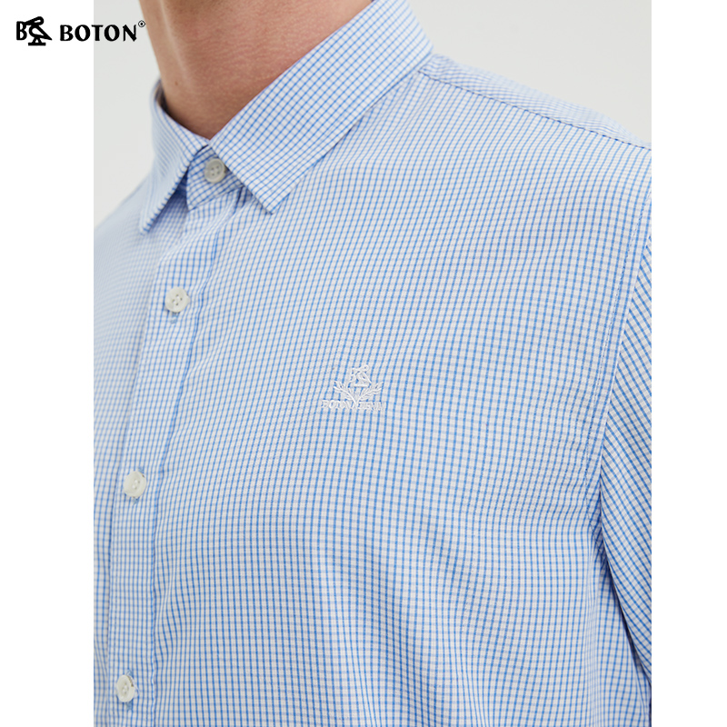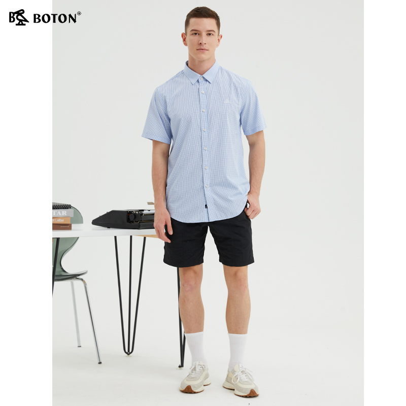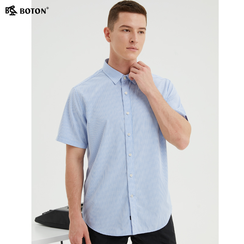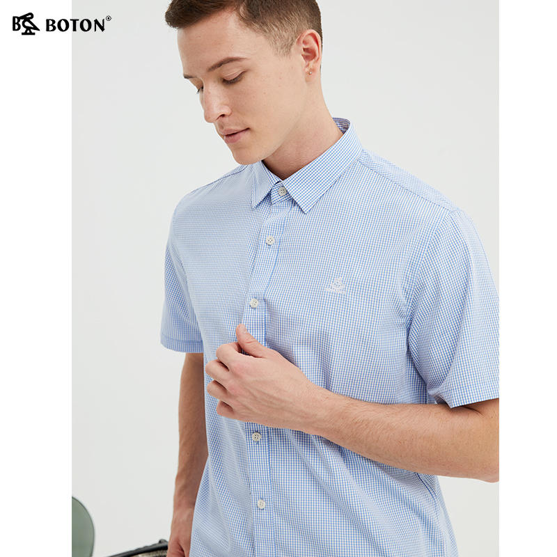 波顿夏季薄款短袖蓝白色格子衬衫男半袖修身百搭衬衣青年