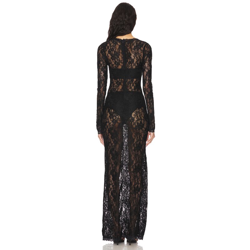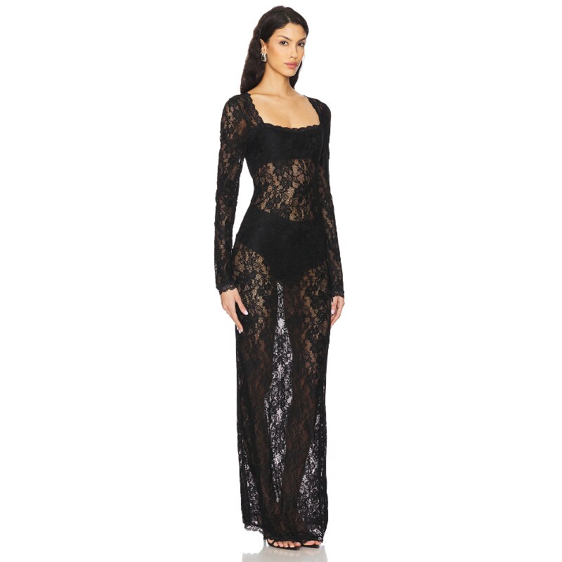 [春季新品]superdown黑色蕾丝连衣裙性感风方领长袖透视裙REVOLVE