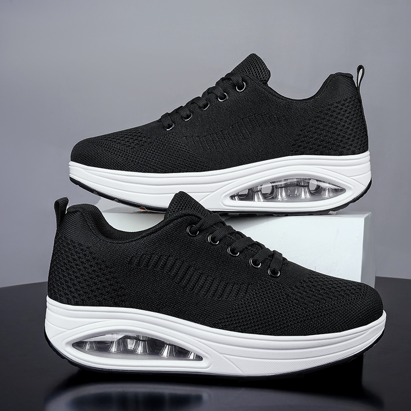 飞织气垫运动鞋女摇摇鞋女厚底坡跟松糕鞋女百搭网面黑色跑步鞋女