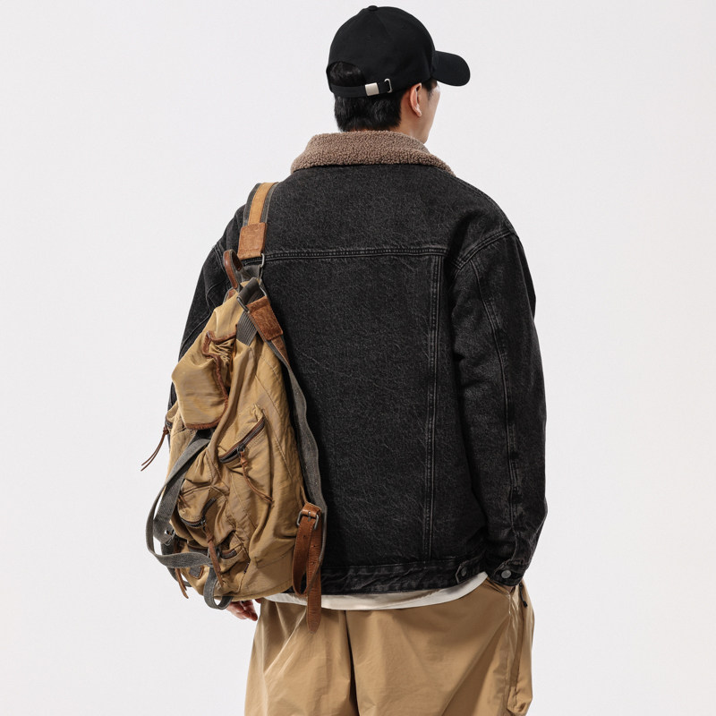 高端欧美宽松牛仔外套男冬季新款加厚夹克复古羊羔绒大码加绒棉服