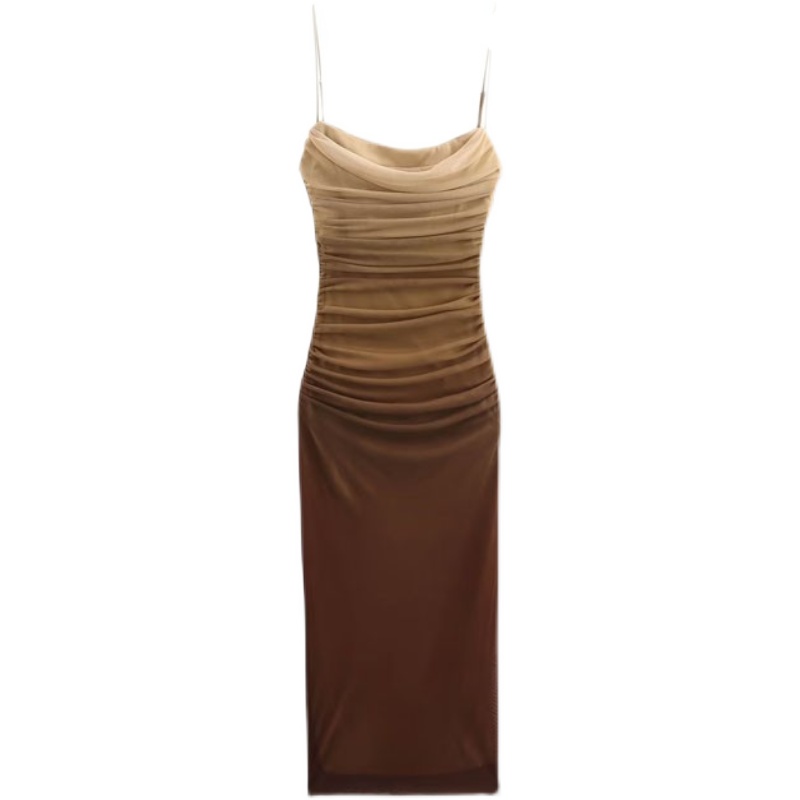 INS欧美博主风渐变色娟网吊带裙修身性感辣妹包臀吊带裙网纱长裙
