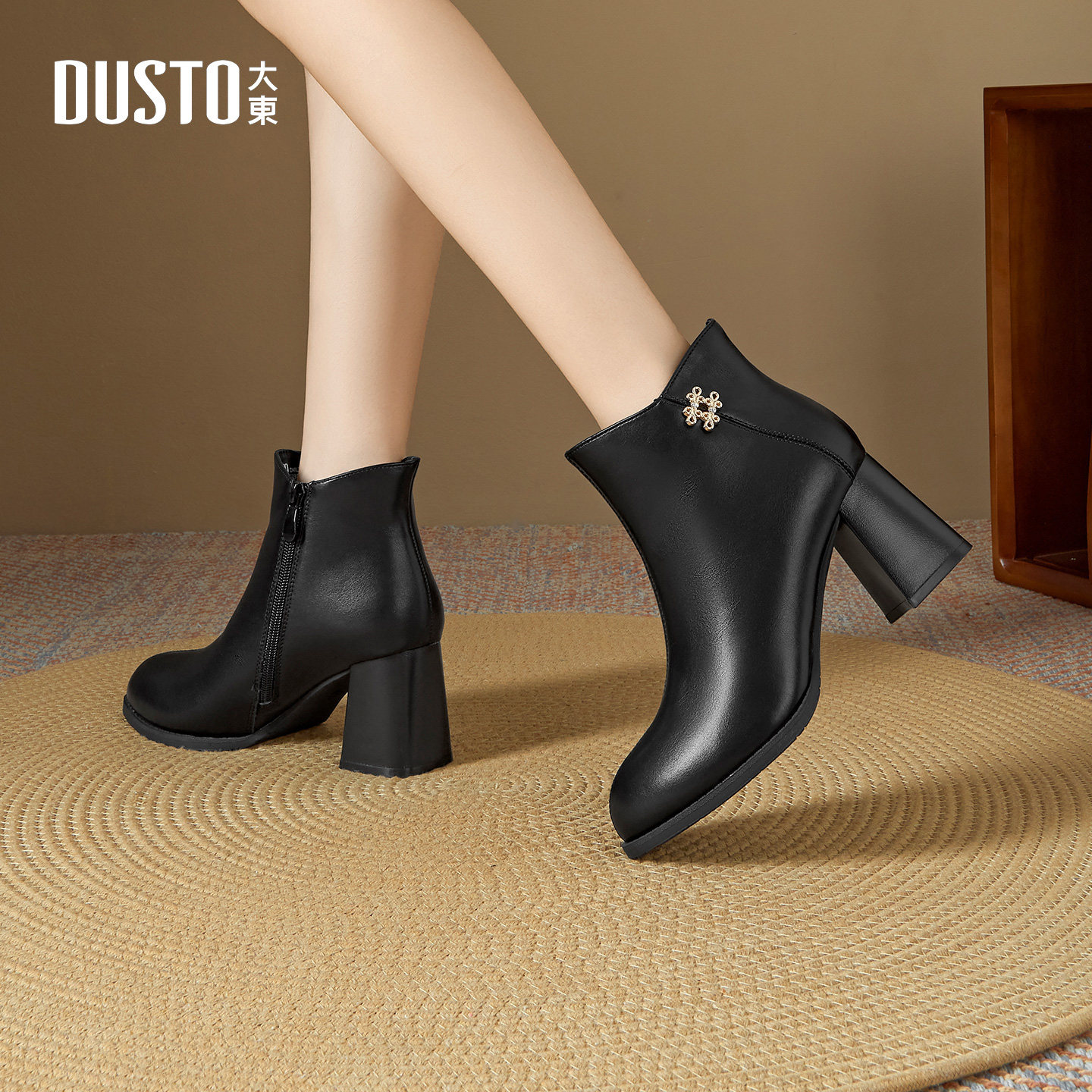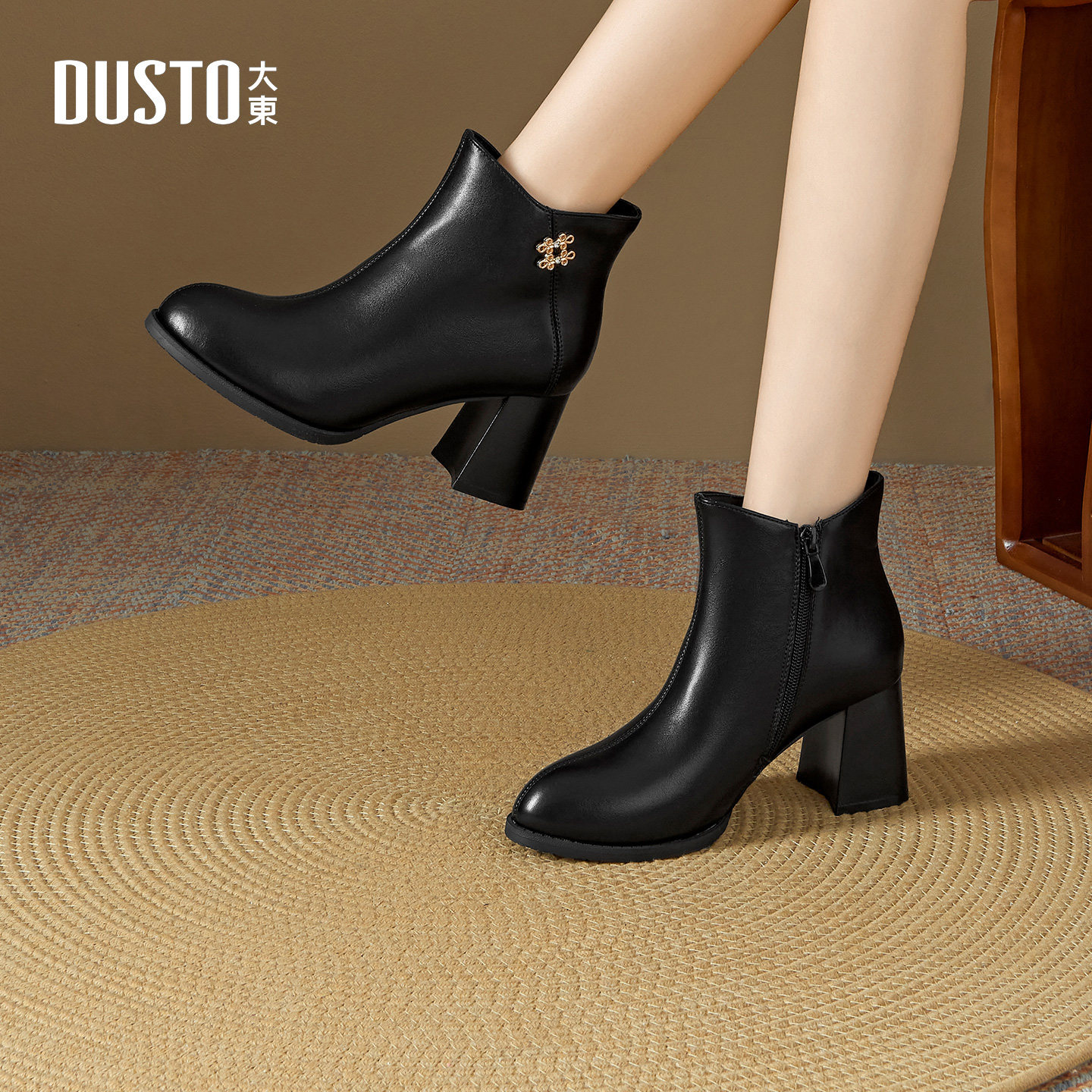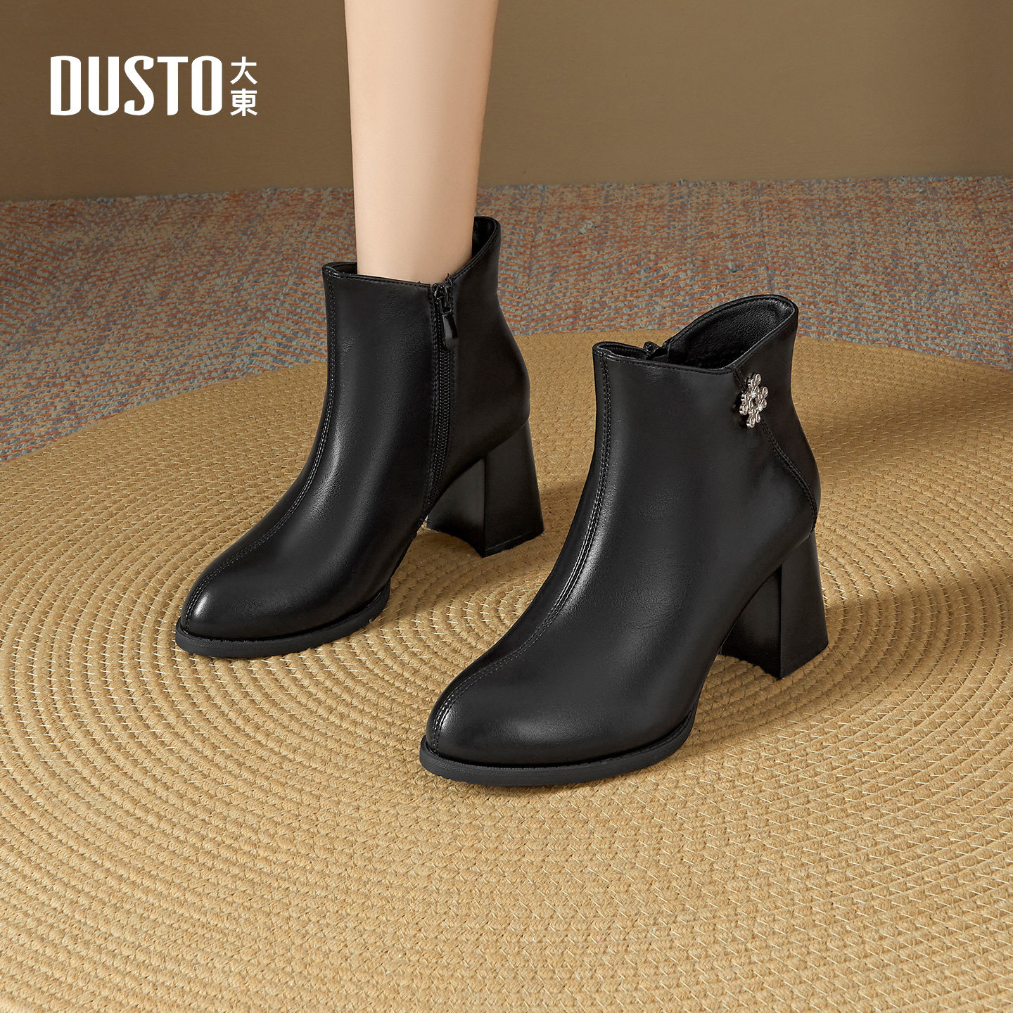 大东时装靴女鞋2025年冬季新款优雅粗跟高跟侧拉链尖头黑色短筒靴