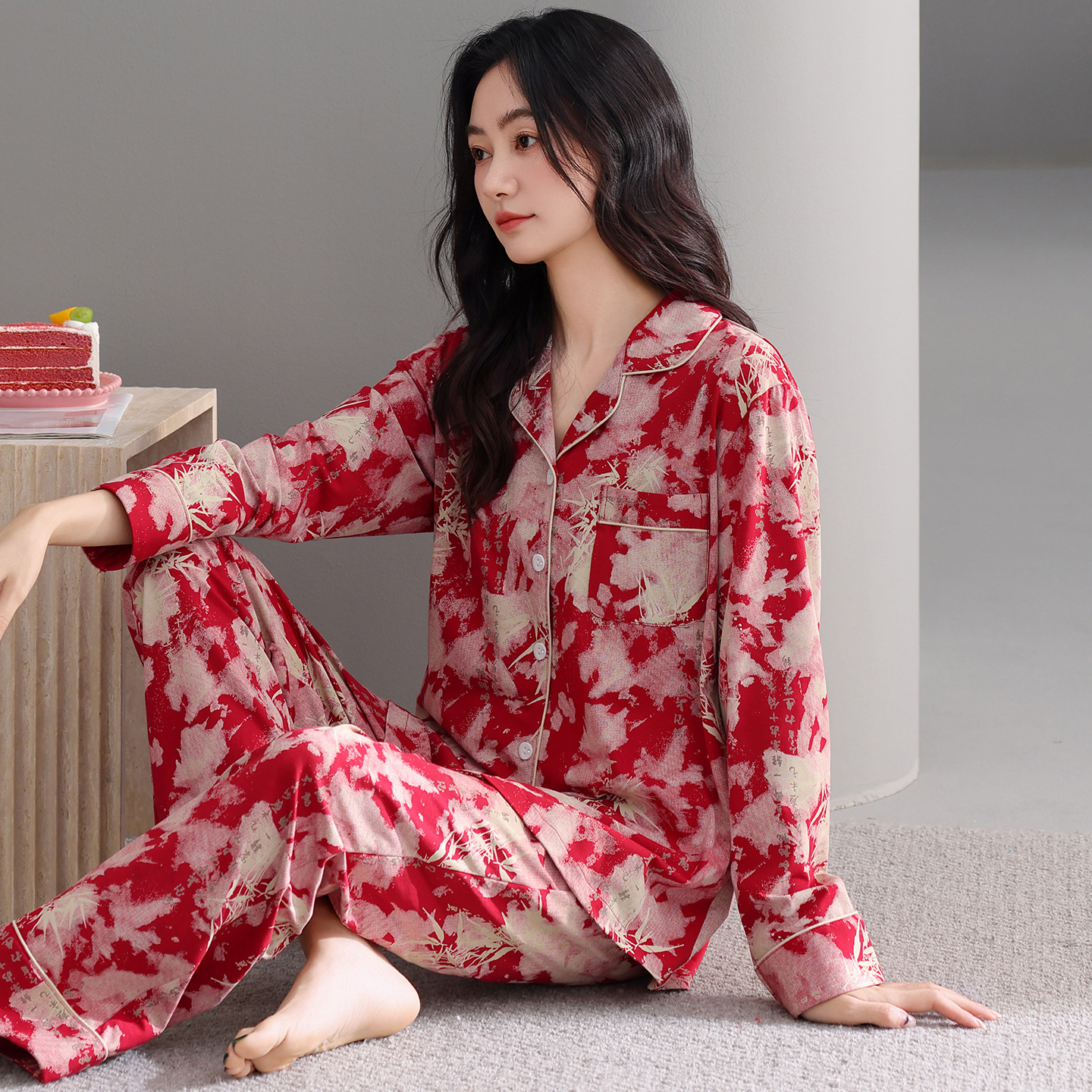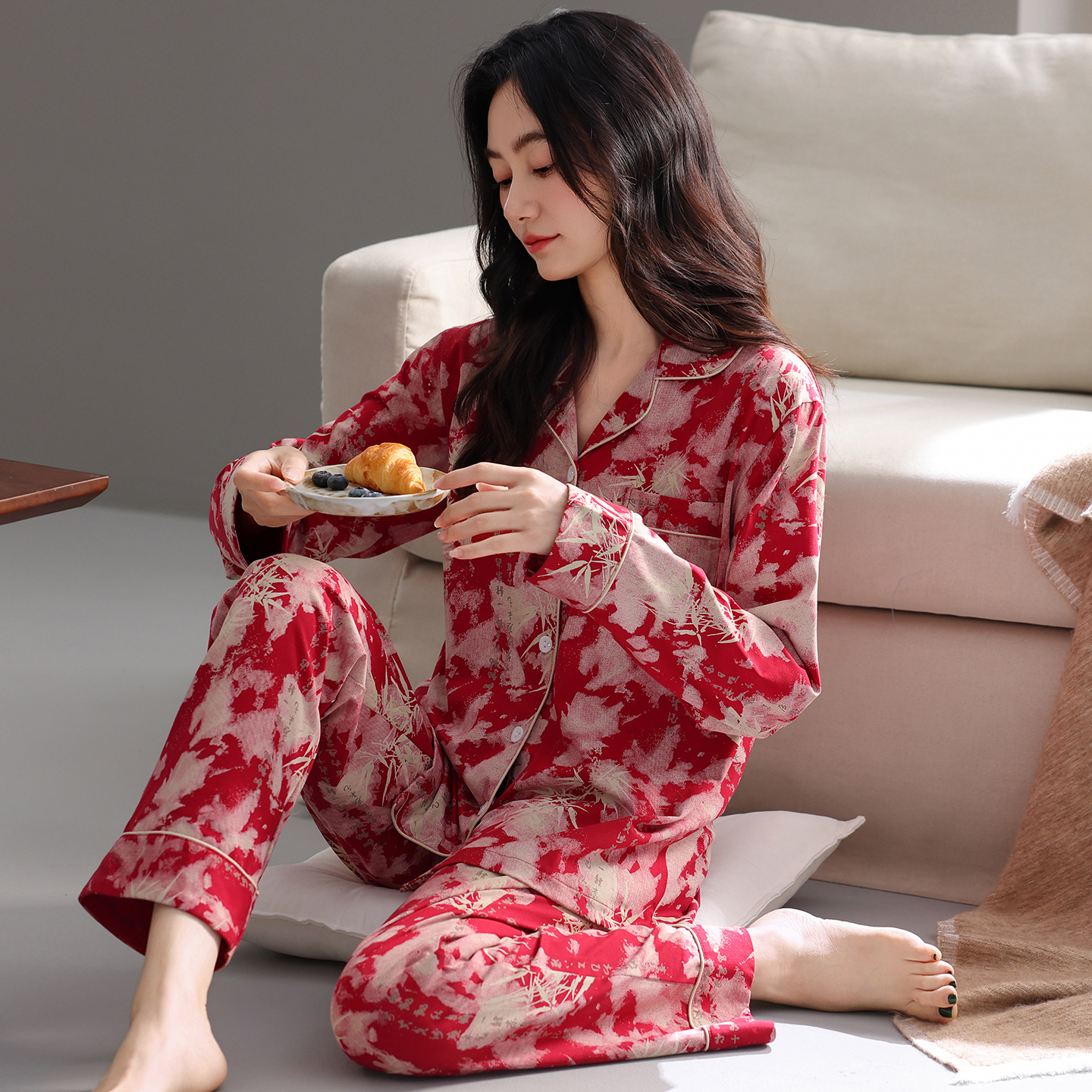 睡衣女士春秋款纯棉长袖红色本命年家居服秋季中年妈妈可外穿套装