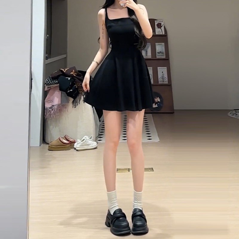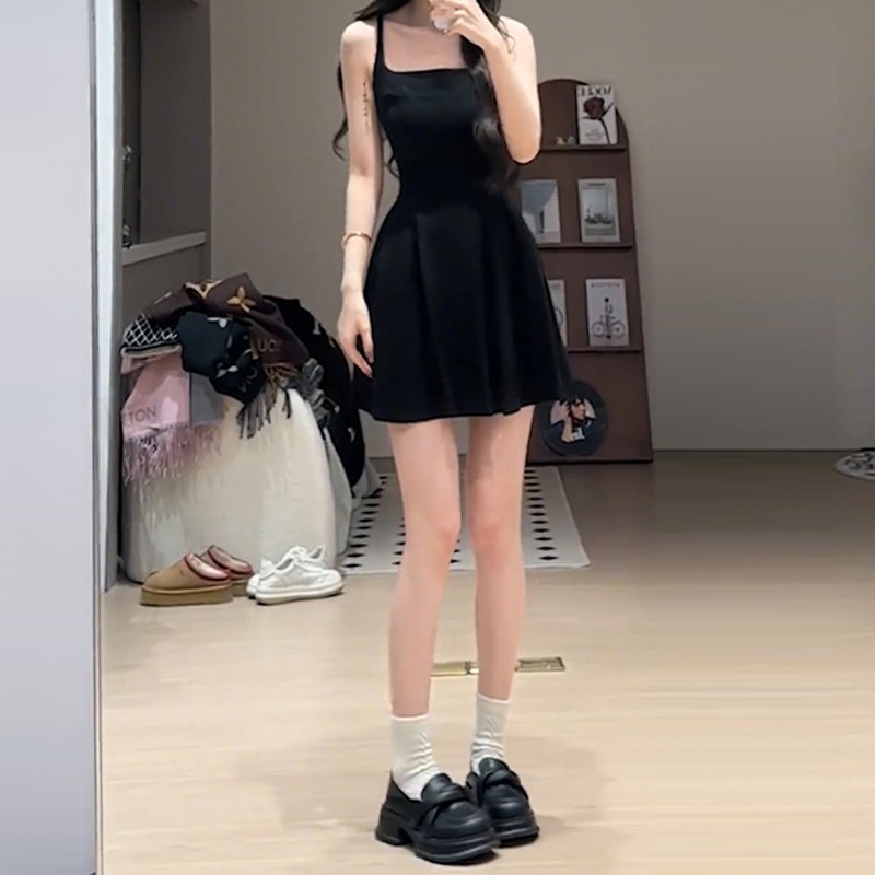 黑色收腰A字吊带连衣裙子女夏季2024早春新款显瘦气质小黑裙短裙