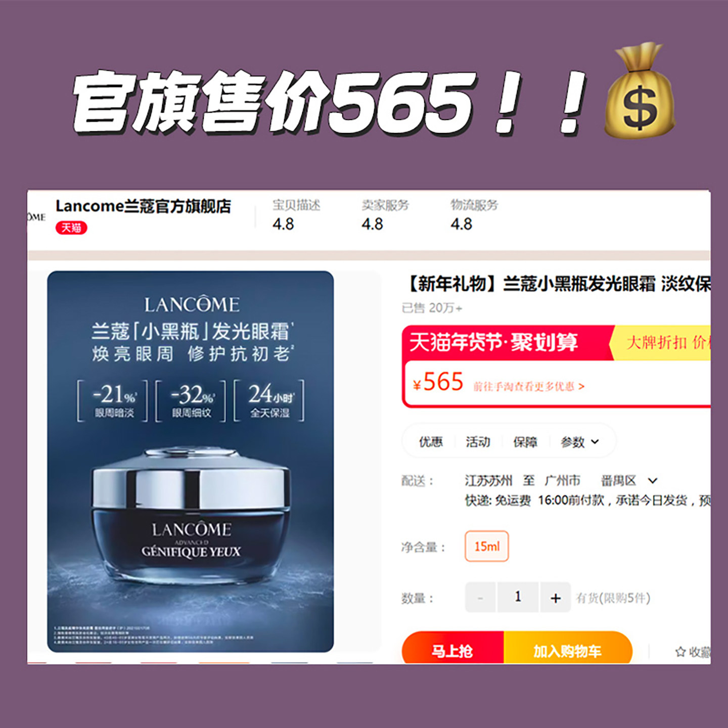 淡黑眼圈神了!Lancome/兰蔻小黑瓶发光眼霜5ml保湿淡纹淡黑眼圈