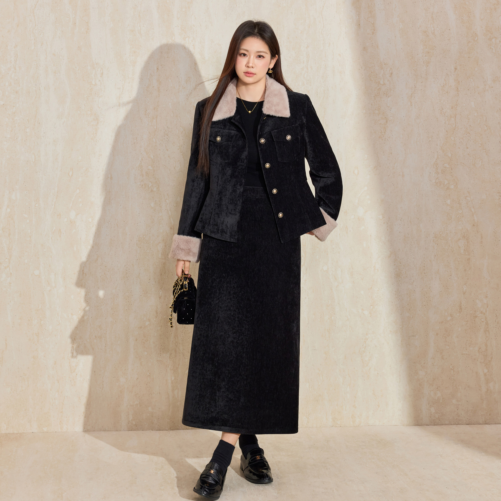 蓝语雪尼尔毛领羽绒服半身裙套装