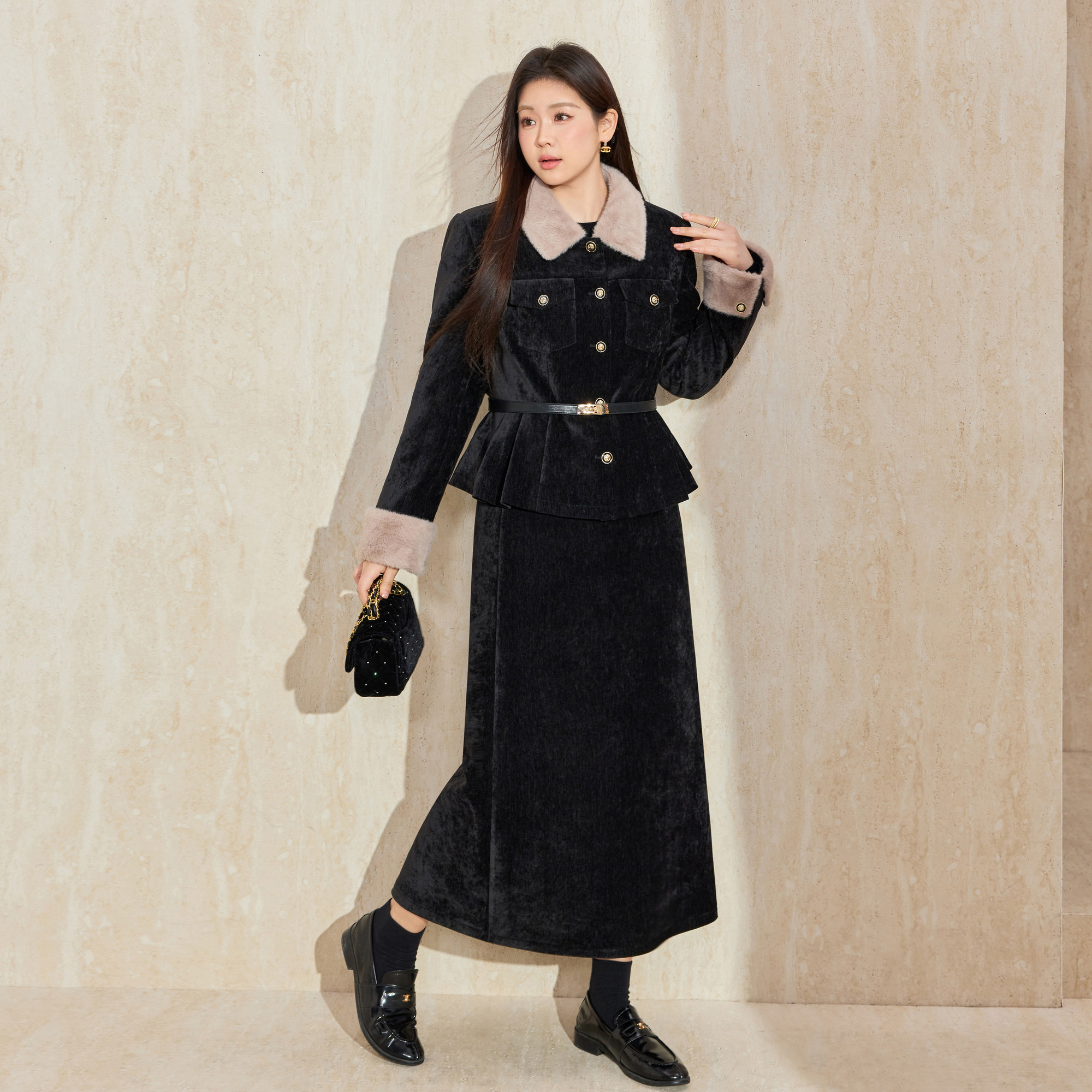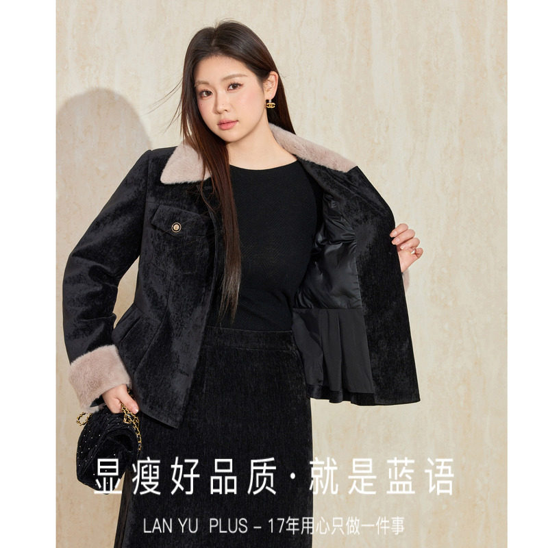 蓝语大码雪尼尔精致毛领收腰羽绒服外套半身裙冬季高级感气质套装