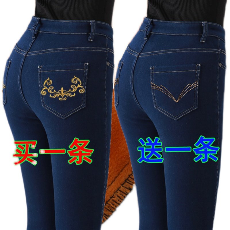 加绒加厚牛仔裤女高腰大码直筒裤中年妈妈保暖秋冬新款裤子带绒