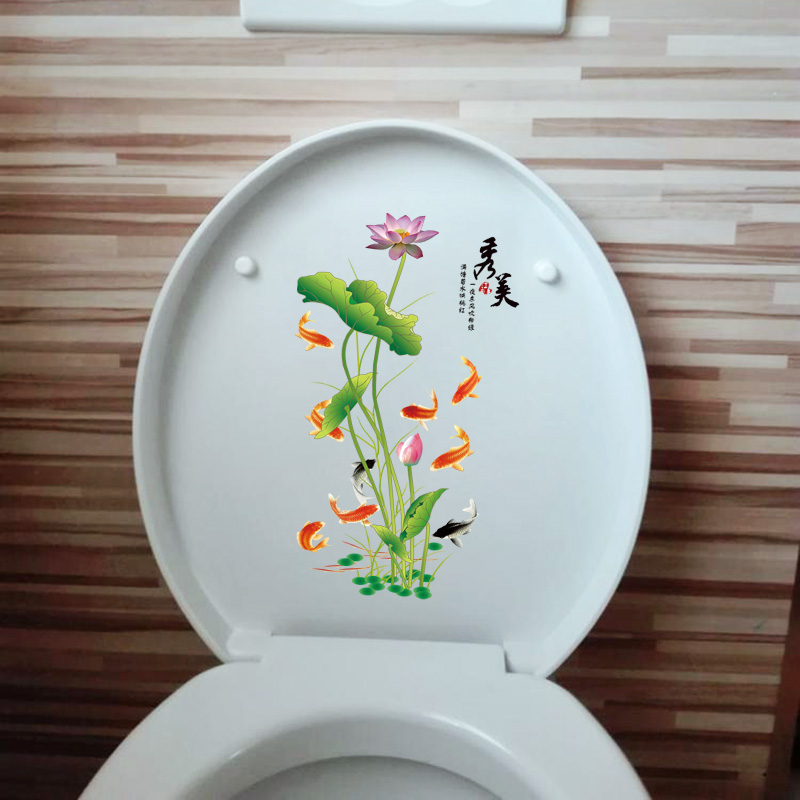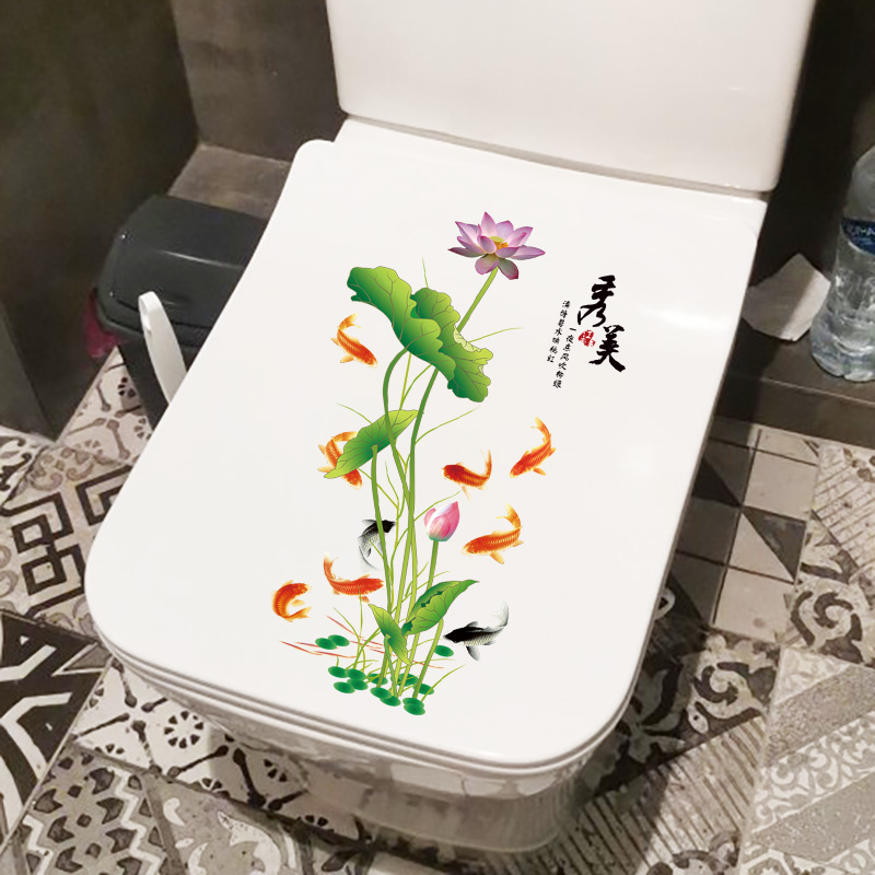 秀美锦鲤荷花创意浴室装饰贴画防水卫生间马桶贴纸自粘家用
