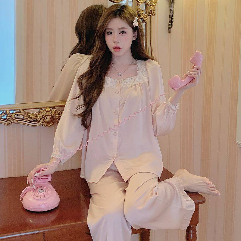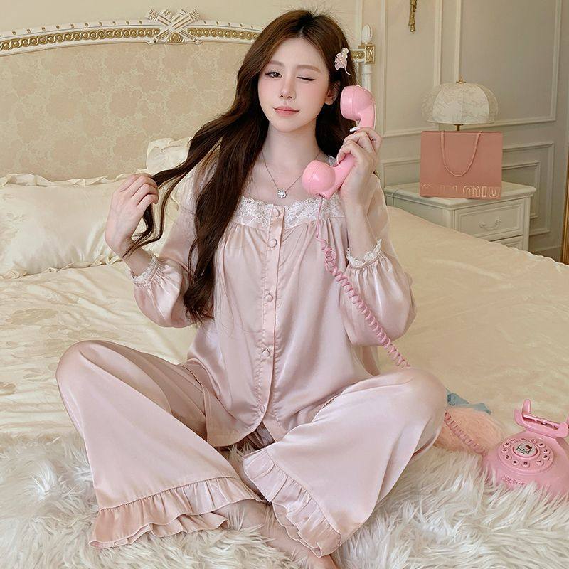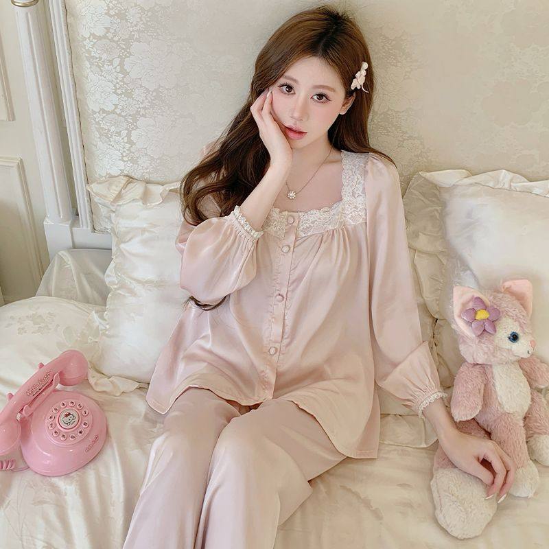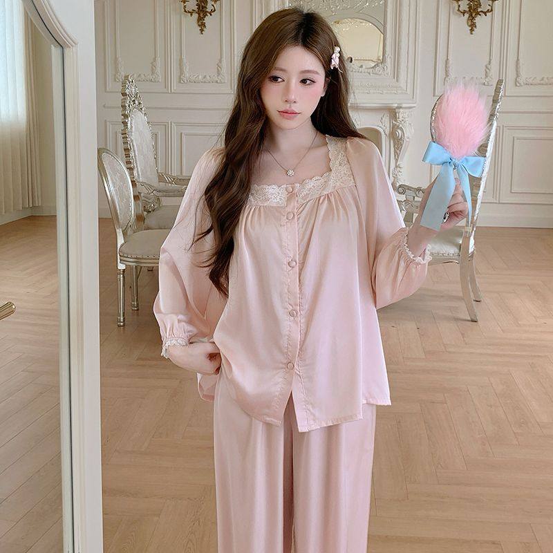 春季长袖冰雪丝睡衣女高级感宫廷风法式开衫蕾丝家居服套装可外穿