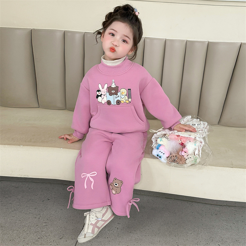 女童秋冬加厚保暖卫衣套装2025新款小女孩可爱印花休闲运动两件套