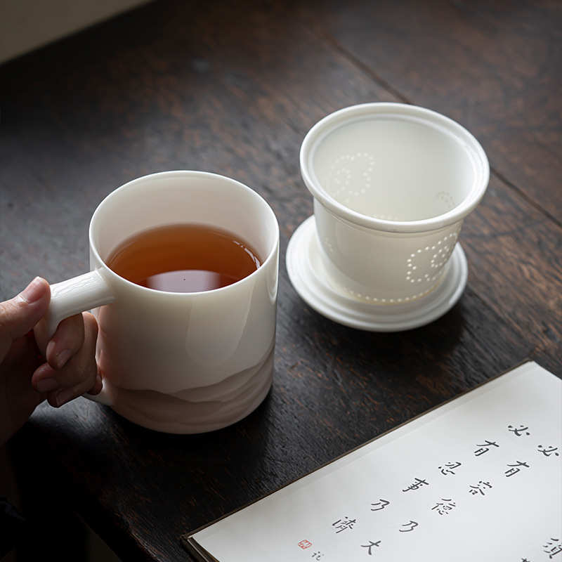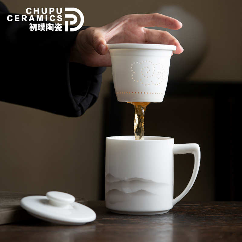 初璞羊脂玉千里江山办公杯陶瓷家用茶水分离杯带盖过滤大容量水杯