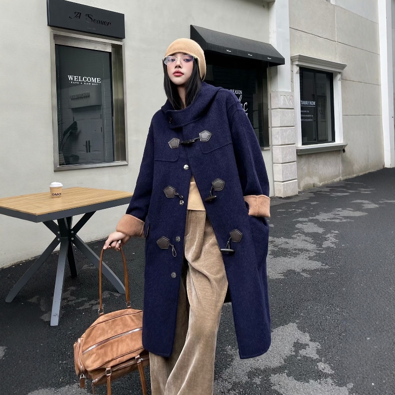 2025新款双面羊绒大衣女中长款过膝系带连帽牛角扣羊毛毛呢外套潮