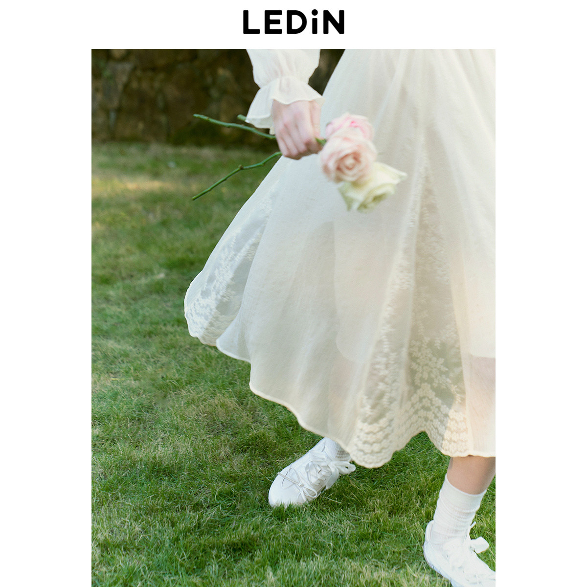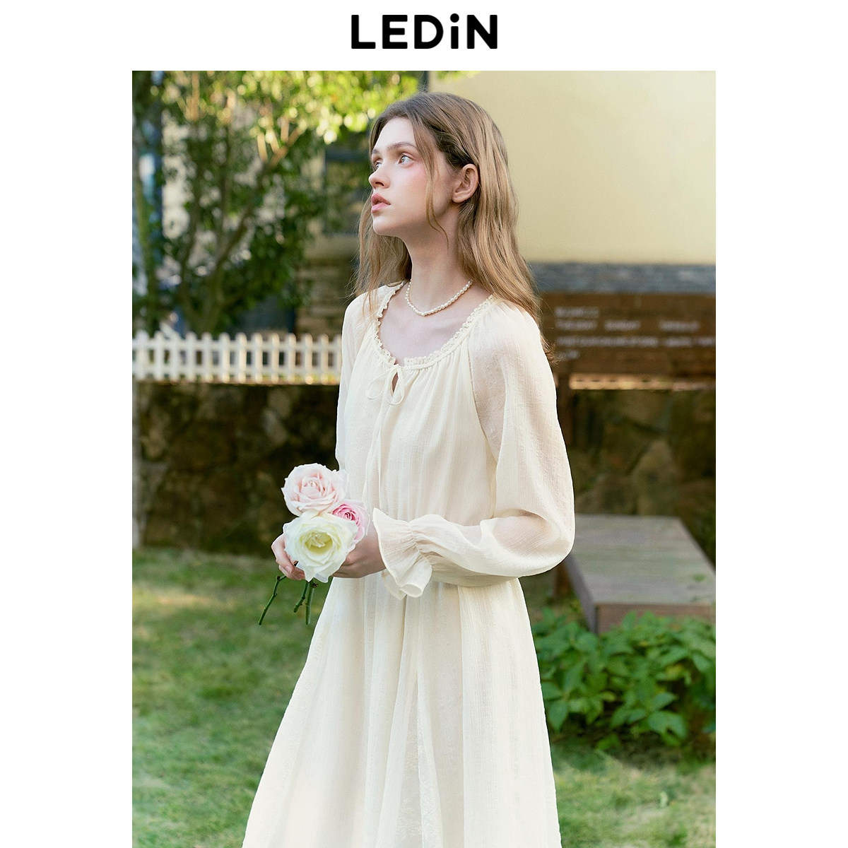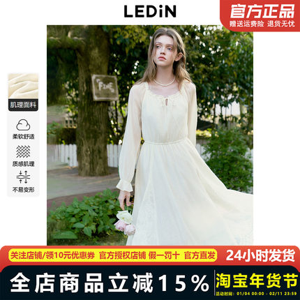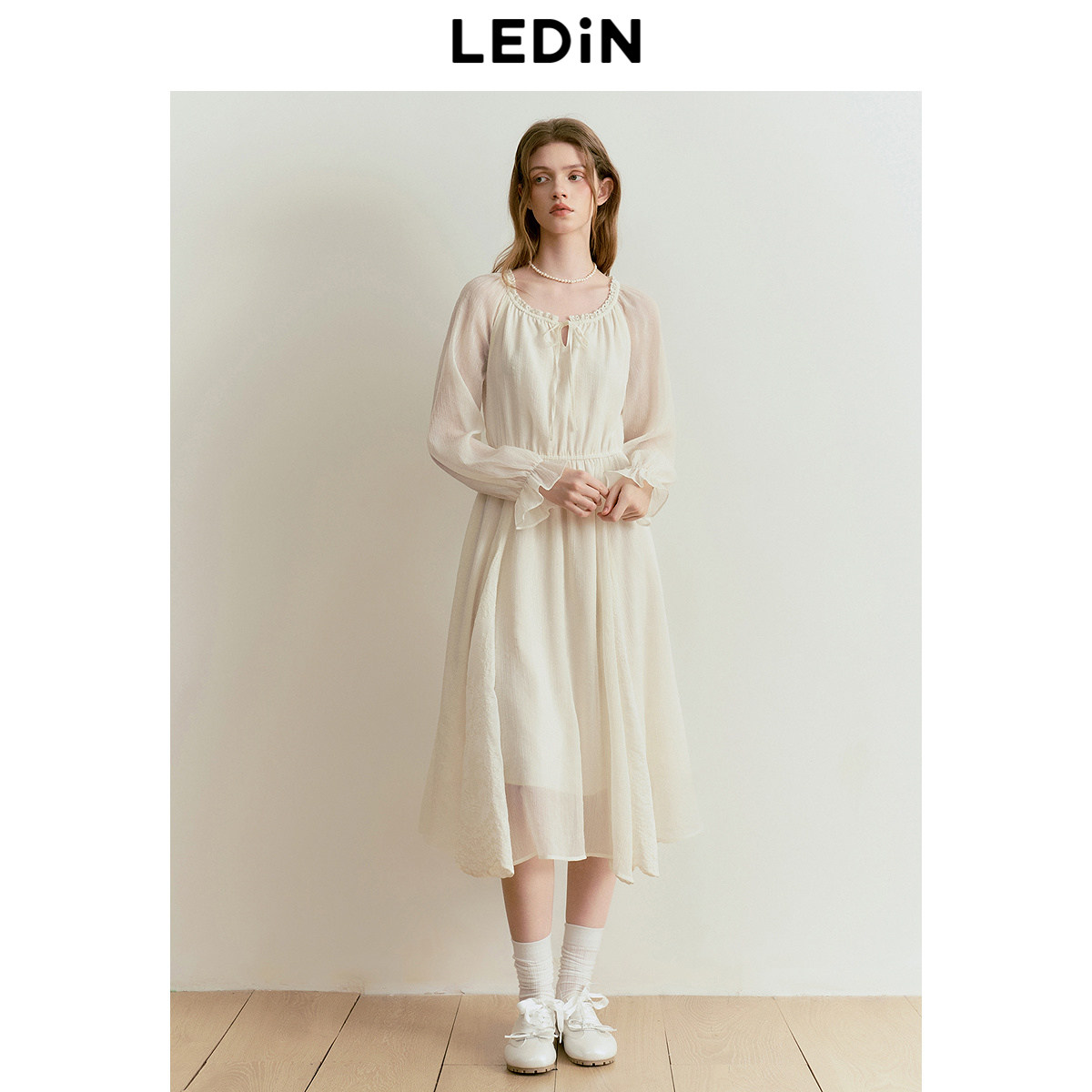 乐町拼接重工蕾丝长袖连衣裙女装25年春季新款松紧腰宽松显瘦长裙