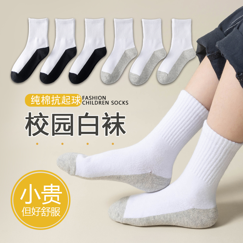 儿童白袜子男童纯棉春秋款大童中童运动白色学生袜耐脏灰底中筒袜