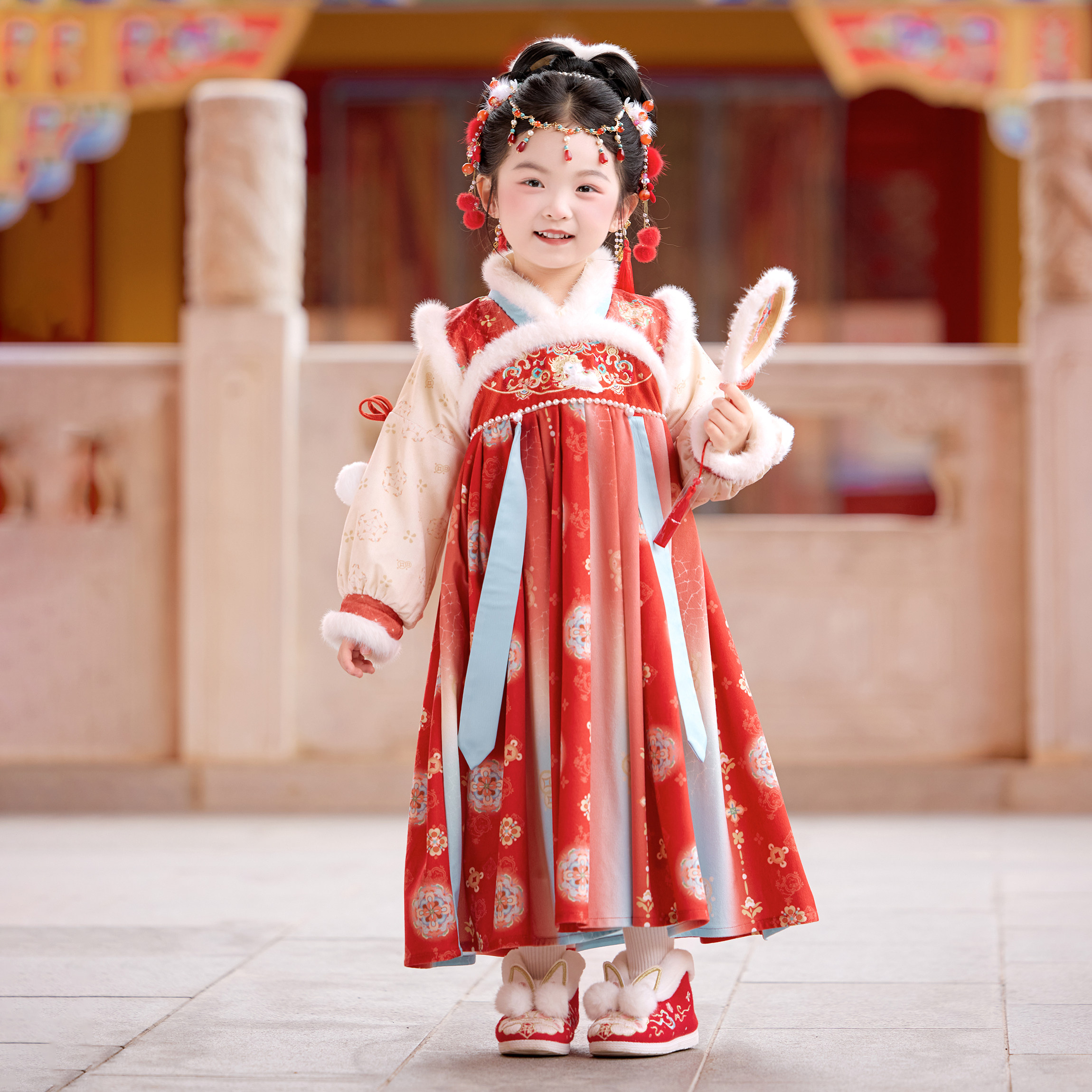 儿童国风仙气加绒红色表演襦裙